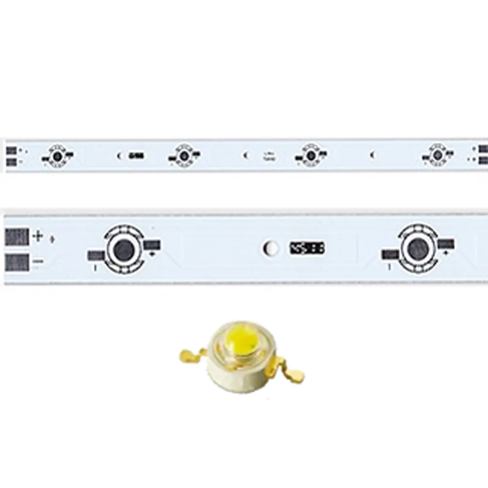 Алюминиевая плата. Размеры 275х16мм. Цвет белый. Для 4-х (последовательно) одноцветных светодиодов Emitter. Под одичночные линзы.
