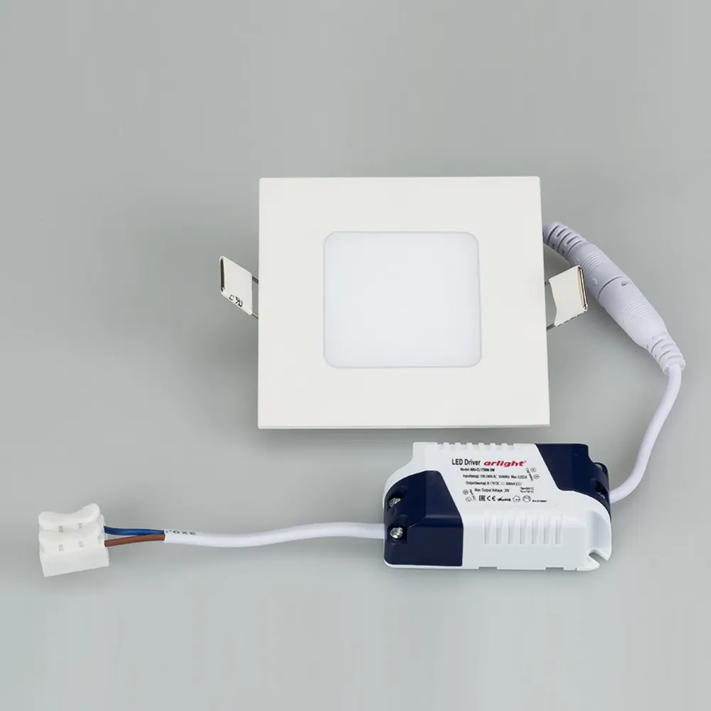 Тонкая панель 3Вт / ТЁПЛЫЙ 2700K / 230лм / 120°. Размер 90 х 90 x 13мм (в отверстие 70х70 мм). Корпус квадратный, белый. Питание 100-240 VAC, драйвер в комлекте (300mA, 8-17V). Не диммируется.