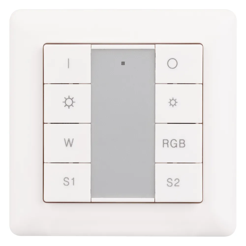Встраиваемая кнопочная белая пластиковая панель для работы по протоколу DALI. Включение/выключение, диммирование и управления цветом свечения (8 кнопок управления) для мультицветных светодиодных RGBW-лент. 1 зона управления, возможно широковещательное управление. Вызов и сохранение 2-х сцен. Питание по шине DALI. Полнофункциональная работа по DALI DT8: до 64 устройств на шине, при адресации 4 каналов (RGBW) на 1 адрес. Стандартная рамка входит в комплект поставки.