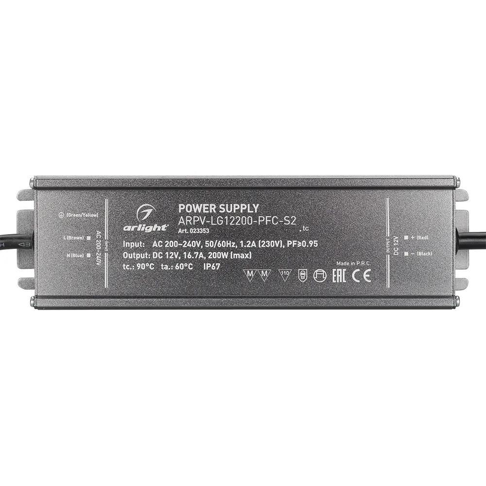 Поставка под заказ от 300 шт. Источник напряжения с гальванической развязкой для светодиодных изделий. Входное напряжение 200-240 VAC. Выходные параметры: 12 В, 16.7 А, 200 Вт. Встроенный PFC >0,95. Герметичный алюминиевый корпус IP 67. Рабочая температура -40…+60C⁰. Габаритные размеры длина 221 мм, ширина 61 мм, высота 36 мм. Гарантийный срок 5 лет.