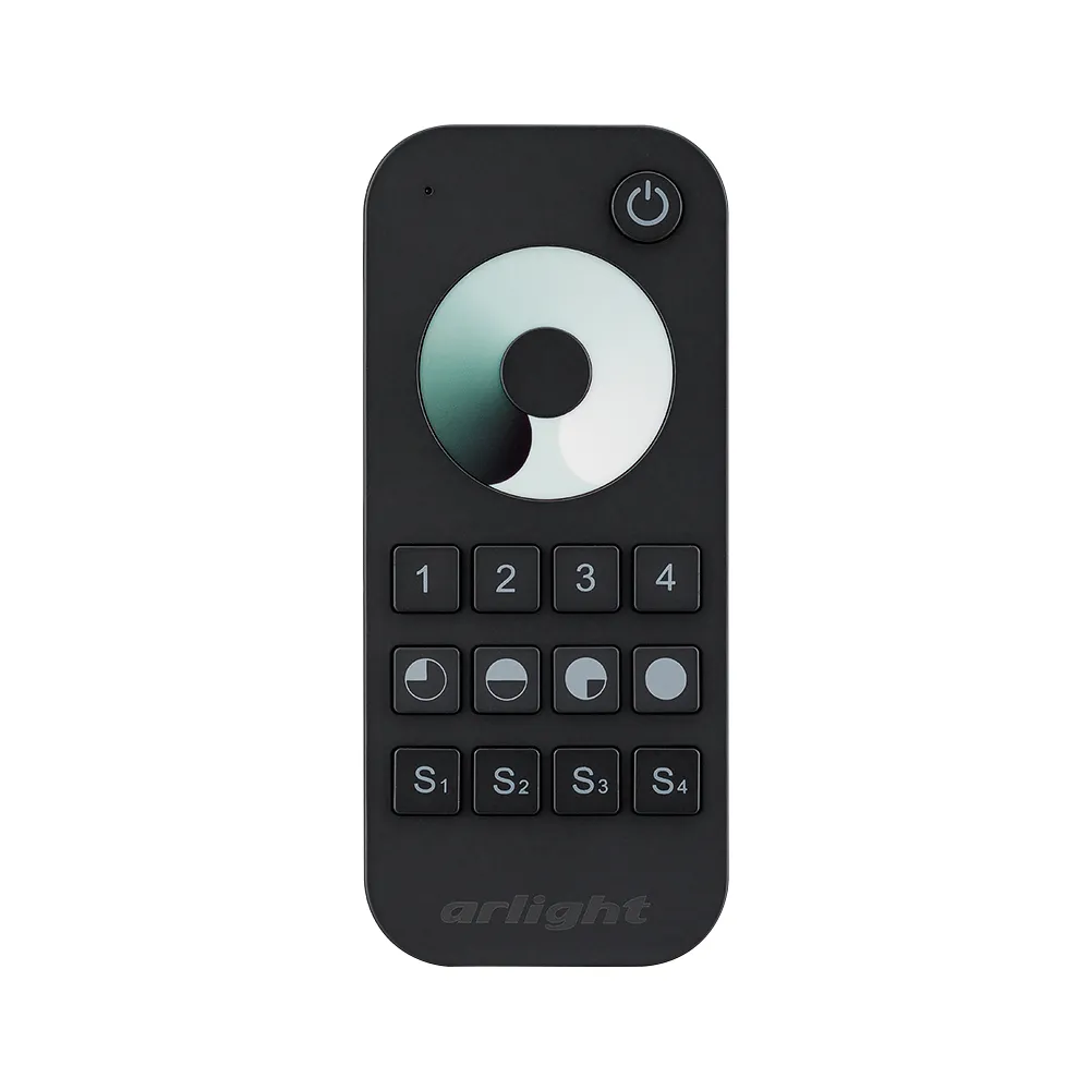 Кнопочный радиопульт с сенсорным кольцом 2.4 ГГц черного цвета для управления одноцветным (DIM) источником света. 4 зоны управления, 4 слота памяти пользовательских настроек, управление яркостью с помощью сенсорного кольца. Питание 3VDC (AAA*2). Габариты 122x53x17.5 мм. Изготовлен из пластика с покрытием Soft Touch. Управляет контроллерами и панелями серии SMART (поставляются отдельно). Настенные держатели приобретаются отдельно (см. аксессуары).