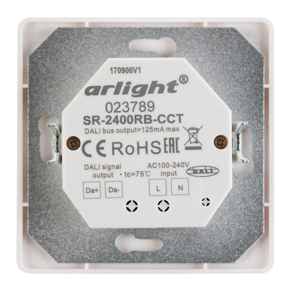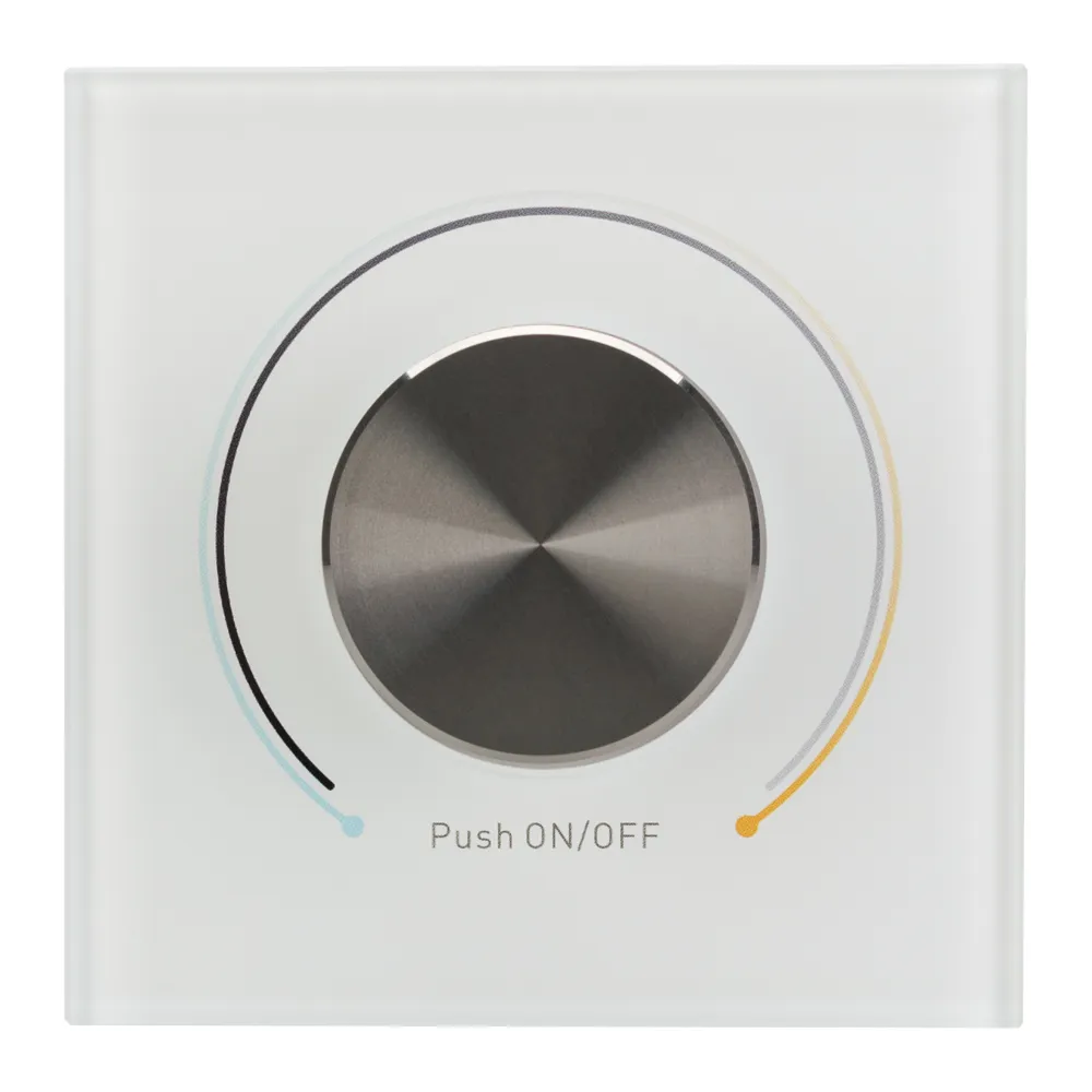 Настенная встраиваемая стеклянная панель белого цвета с роторным (поворотным) управлением для светодиодных MIX-лент. Питание 100-240 VAC, встроенный источник тока для DALI-шины. Система команд DT8, до 64 устройств (DALI-DT8), при адресации DT8 4 каналов (CW+WW) на 1 адрес.