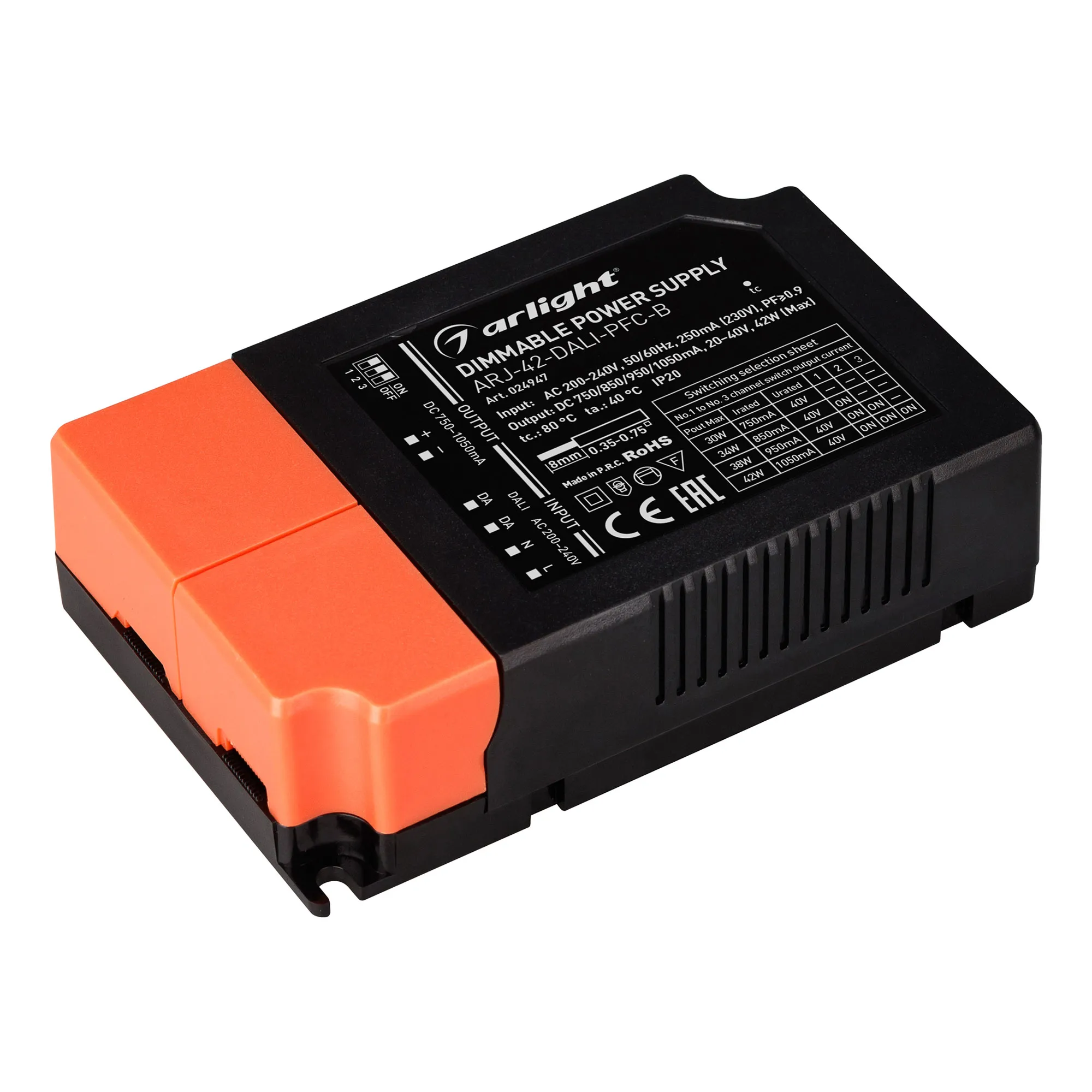 Диммируемый источник тока по протоколу DALI с гальванической развязкой для светильников и мощных светодиодов. Входное напряжение 200-240 VAC. Выходные параметры: 20-40 В, 750-1050 mА, 42 Вт. Встроенный PFC >0.9. Негерметичный пластиковый корпус IP 20. Габаритные размеры длина 106 мм, ширина 66.5 мм, высота 30 мм. Гарантийный срок 5 лет.