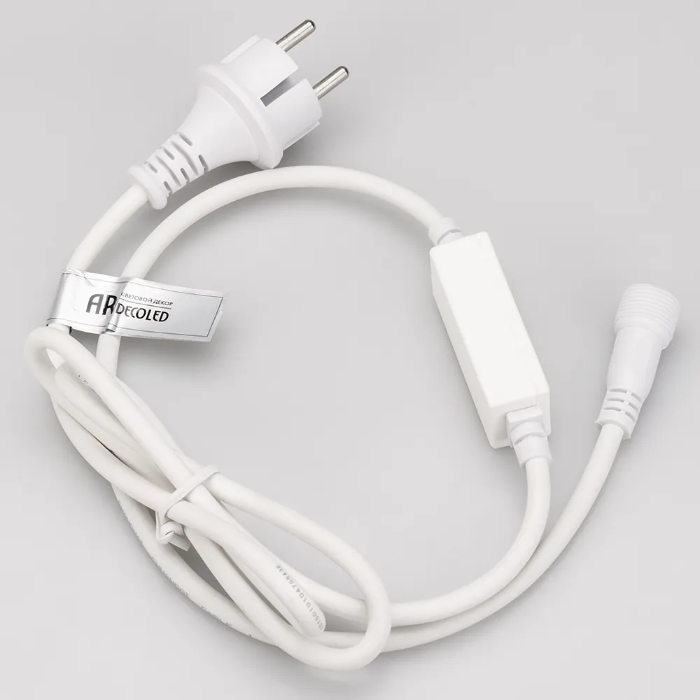 Шнур питания для светодиодных гирлянд постоянного свечения. Материал оболочки РЕЗИНА (каучук). Цвет провода белый. В комплект входит: шнур питания с вилкой европейского стандарта (IP44), 2pin разъём подключения к гирлянде, выпрямитель AC/DC (1.6A). Длина провода 1.5 метра.