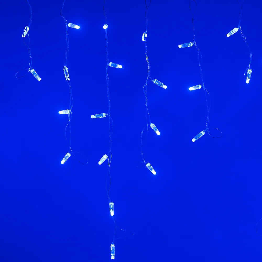 Светодиодная бахрома Classic. Размер 2400x600 мм (длина 2400 мм, по длине 24 нити высотой 200/600 мм). Количество светодиодов 88 шт размером 7 мм. Цвет свечения СИНИЙ, эффект постоянного свечения с резким световым рисунком (прозрачная вогнутая линза). Провод прозрачный, ПВХ. Питание 230 В, Мощность 6 Вт, защита IP65, применение на улице под навесом. Аксессуары для подключения приобретаются отдельно.