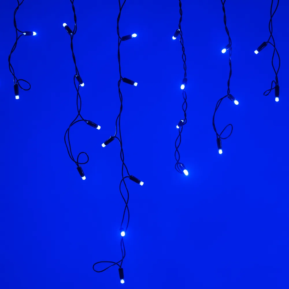 Светодиодная бахрома Classic. Размер 2400 мм (длина 2400 мм, по длине 24 нити высотой 200/600 мм). Количество светодиодов 88 шт размером 7 мм. Основной цвет свечения СИНИЙ, эффект мерцания редких точек (БЕЛЫЙ 6000К) с резким световым рисунком (прозрачная вогнутая линза), соотношение светодиодов: 66 синих постоянного свечения / 12 белых с мерцанием. Эффект частого мерцания. Провод черный, ПВХ. Питание 230 В, Мощность 6 Вт, защита IP65, применение на улице под навесом. Аксессуары для подключения приобретаются отдельно.