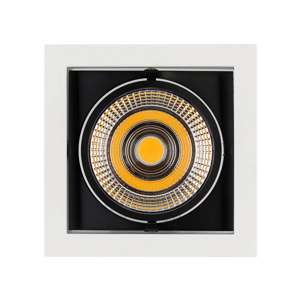 Поставка под заказ от 100 штук. Встраиваемый карданный светильник. Угол 30° / 25Вт / БЕЛЫЙ 6000K / 2200лм, CRI>90. Корпус из белого алюминия с черными вставками. Питание AC220-240V, 25Вт, 700mA 30-42V, драйвер в комплекте. Размеры LxWxH: 152х152x95мм, отверстие для установки 140x140мм.