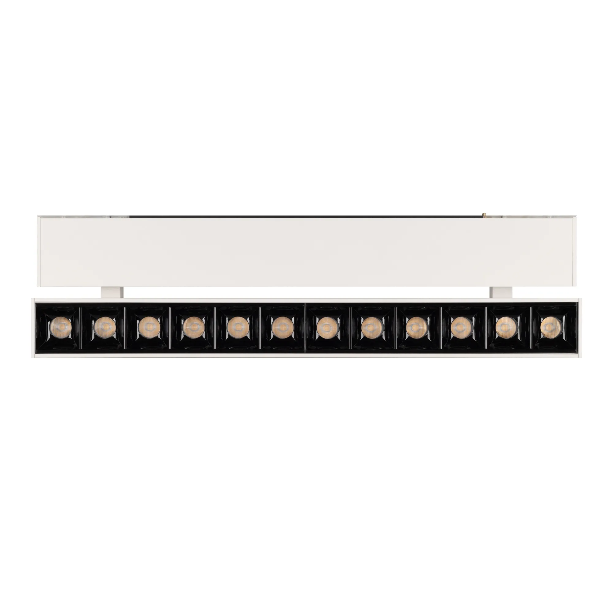 Светильник поворотный для магнитных треков шириной 45мм, 12Вт. Цвет свечения ДНЕВНОЙ 4000K, световой поток 890лм, угол 15°, CRI>90. Корпус прямоугольный, металл, цвет белый, IP20. Размеры LxWxH 322x35x92.5мм. Входное напряжение DC24V, мощность 12Вт. Драйвер DС24V/AC230V поставляется отдельно. Диммируется только с 026407(1), 027633.
