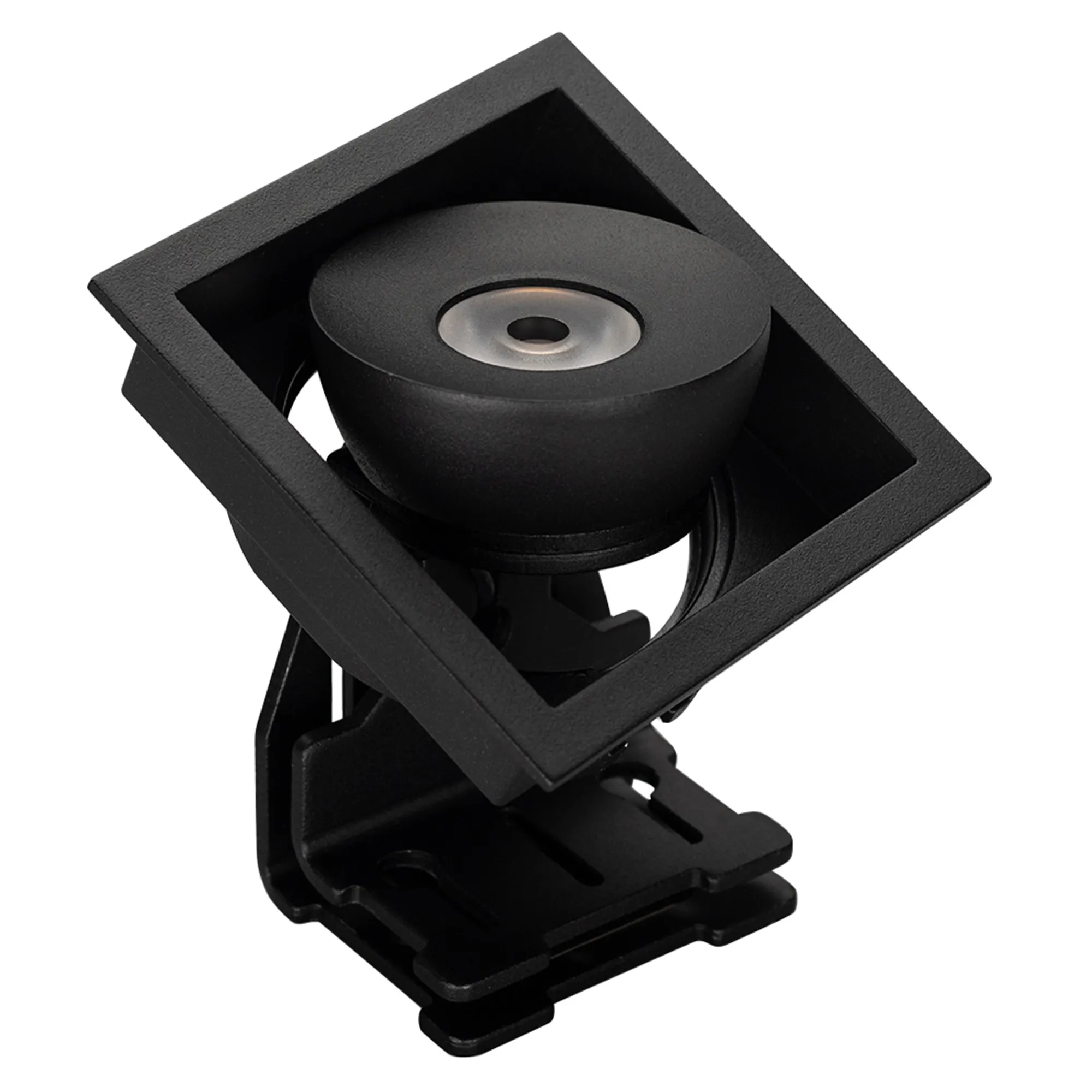 Встраиваемый поворотный светильник для потолка. Мощность 9W, цвет ТЕПЛЫЙ 3000K, св.поток 630лм, угол 45°, RA>90. Корпус квадратный черный. Питание AC230V. Размеры LxWxH 80x80x90мм. Установка в отверстие 70x70мм. Драйвер в комплекте (30-45V, 220mA).