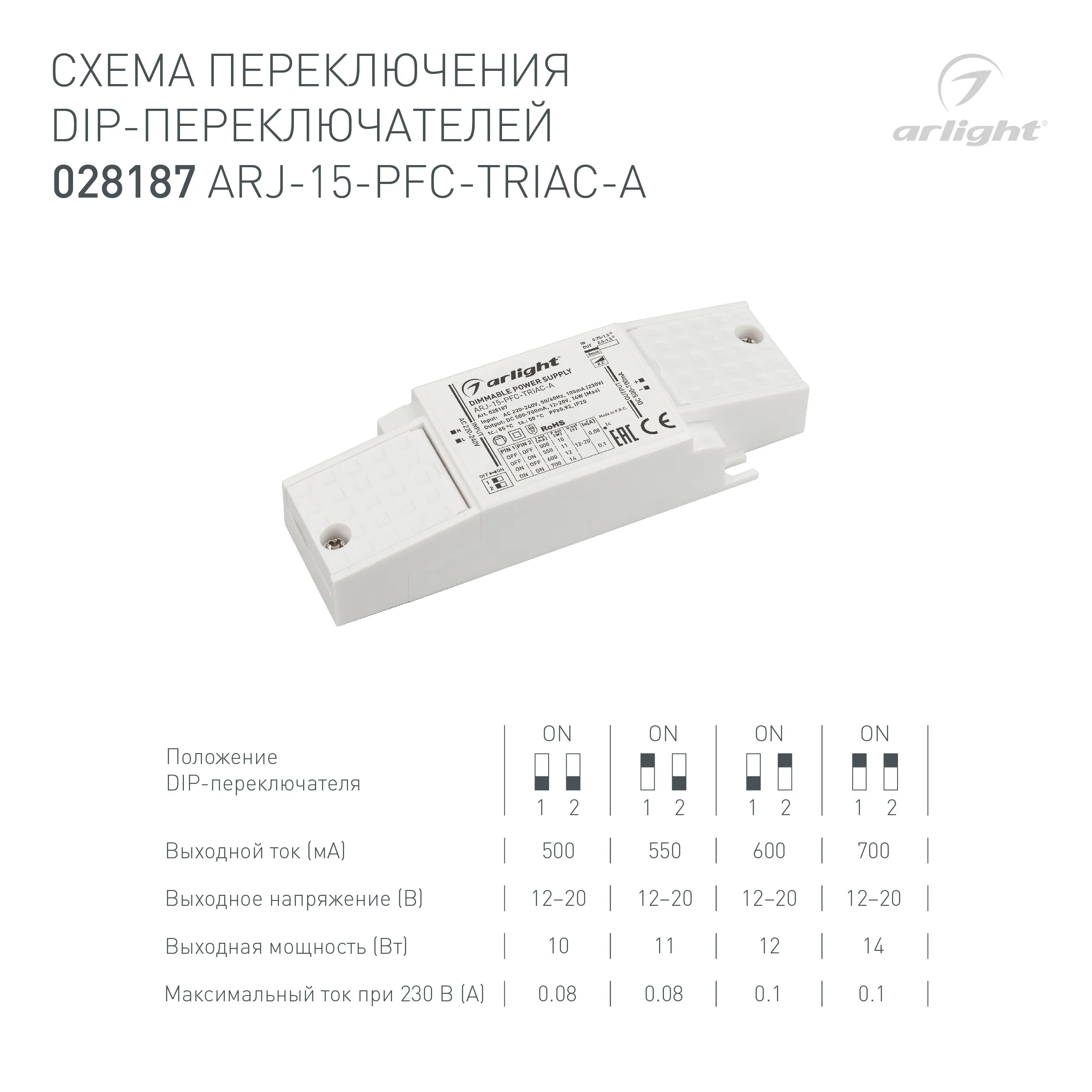 Блок питания ARJ-15-PFC-TRIAC-A (14W, 500-700mA) (Arlight, IP20 Пластик, 5 лет)