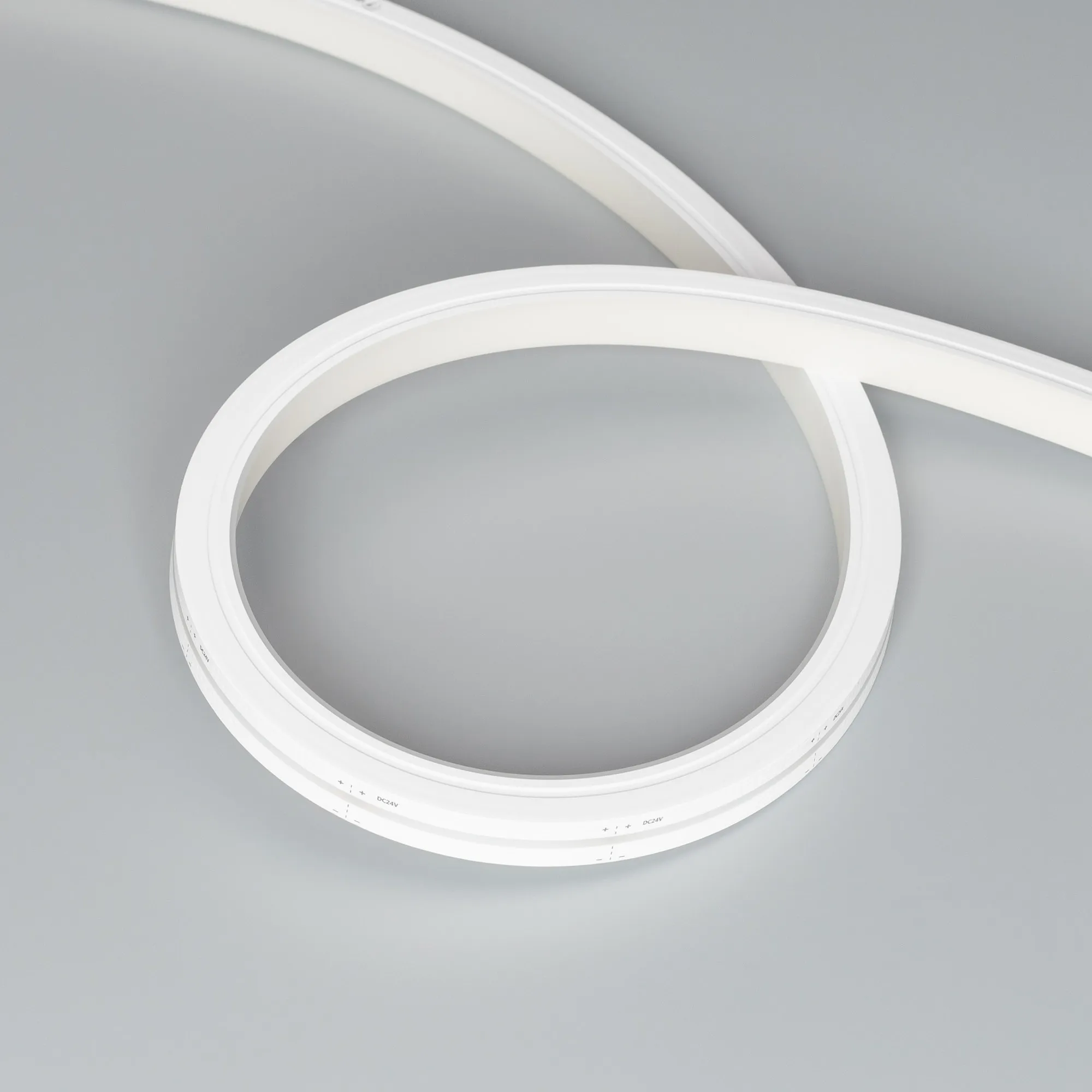 ОБРАЗЕЦ Ультра яркий гибкий неон MOONLIGHT в силиконовой оболочке. Светодиоды SMD5060, 84 шт-м, цвет RGB. Сечение 12х13 мм, вертикальный изгиб, IP67, шаг резки 83 мм (7 светодиодов), мощность 12 Вт-м, напряжение питания DC 24, минимальный радиус изгиба 60 мм. В комплекте: 1 силовой коннектор, 1 заглушка, 1 шнур питания.