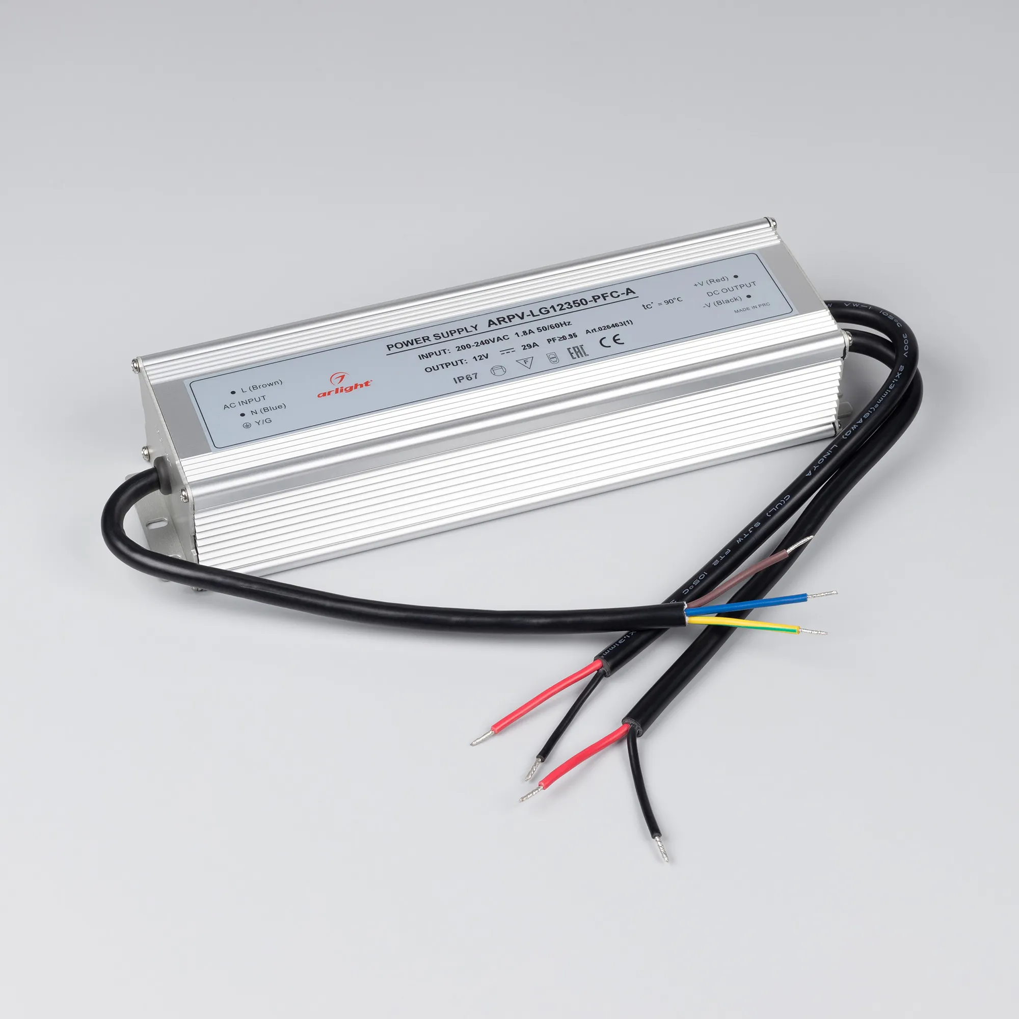 Источник напряжения с гальванической развязкой для светодиодных изделий. Входное напряжение 180-264 VAC. Выходные параметры: 12 В, 29 А, 350 Вт. Встроенный PFC >0,95. Герметичный алюминиевый корпус IP 67. Рабочая температура -40…+70C⁰. Габаритные размеры длина 258 мм, ширина 74 мм, высота 46 мм. Гарантийный срок 5 лет.