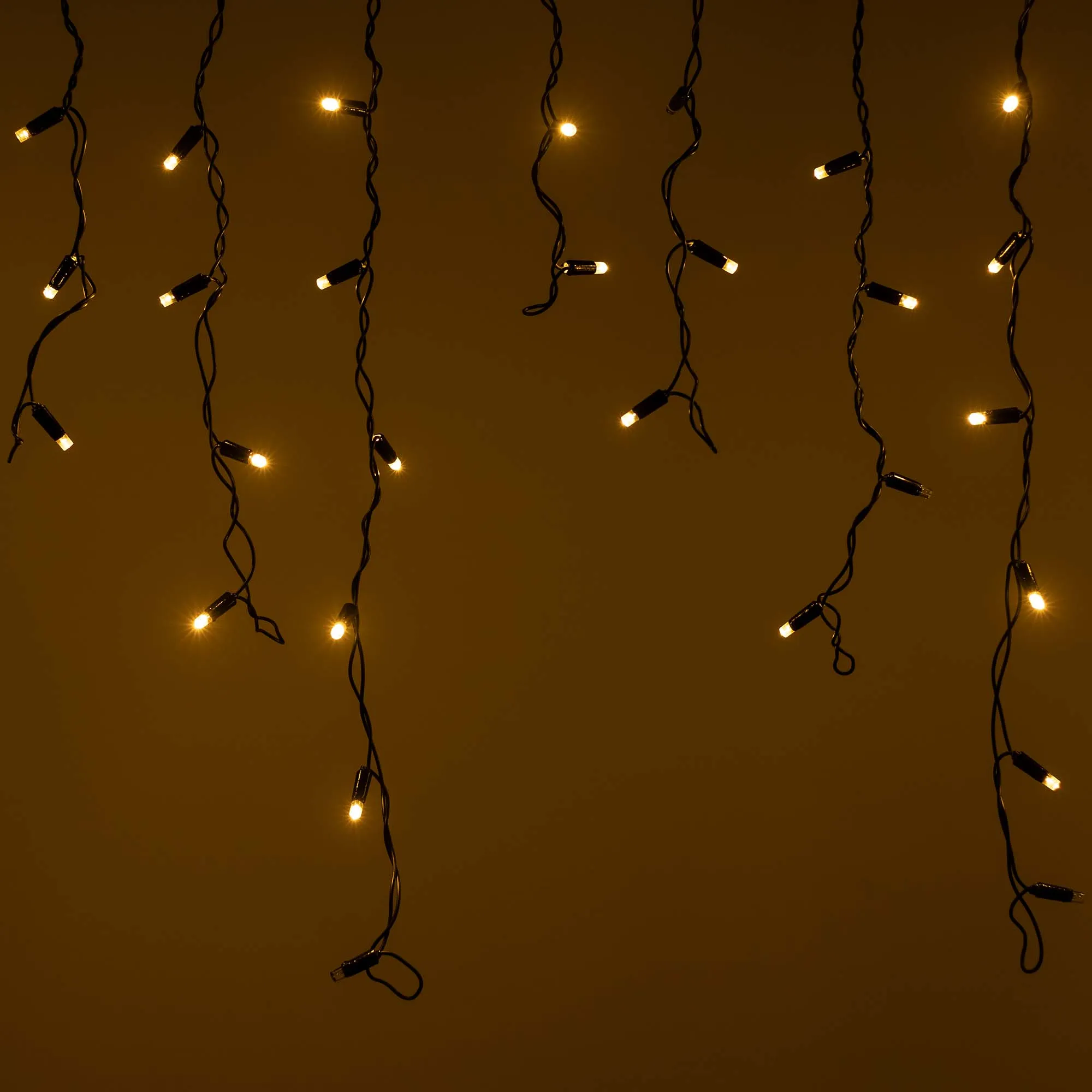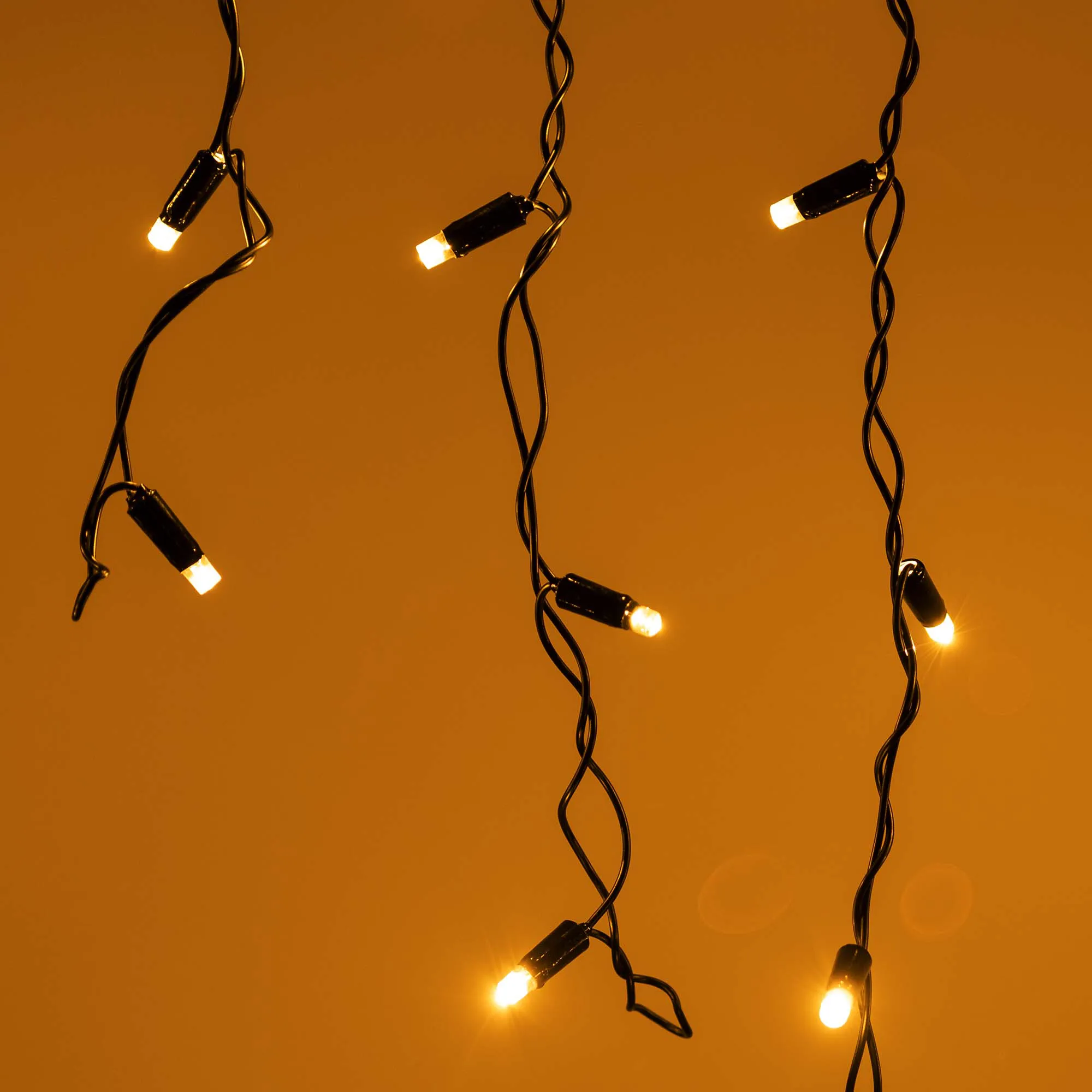 Светодиодная бахрома Classic. Размер 2400 мм (длина 2400 мм, по длине 24 нити высотой 200/600 мм). Количество светодиодов 88 шт размером 7 мм. Основной цвет свечения ТЕПЛЫЙ БЕЛЫЙ (3000 К), эффект мерцания редких точек (ТЕПЛЫЙ БЕЛЫЙ 3000К) с резким световым рисунком (прозрачная вогнутая линза), соотношение светодиодов: 66 теплых постоянного свечения / 12 теплых с мерцанием. Провод черный, ПВХ. Питание 230 В, Мощность 6 Вт, защита IP65, применение на улице под навесом. Аксессуары для подключения приобретаются отдельно.