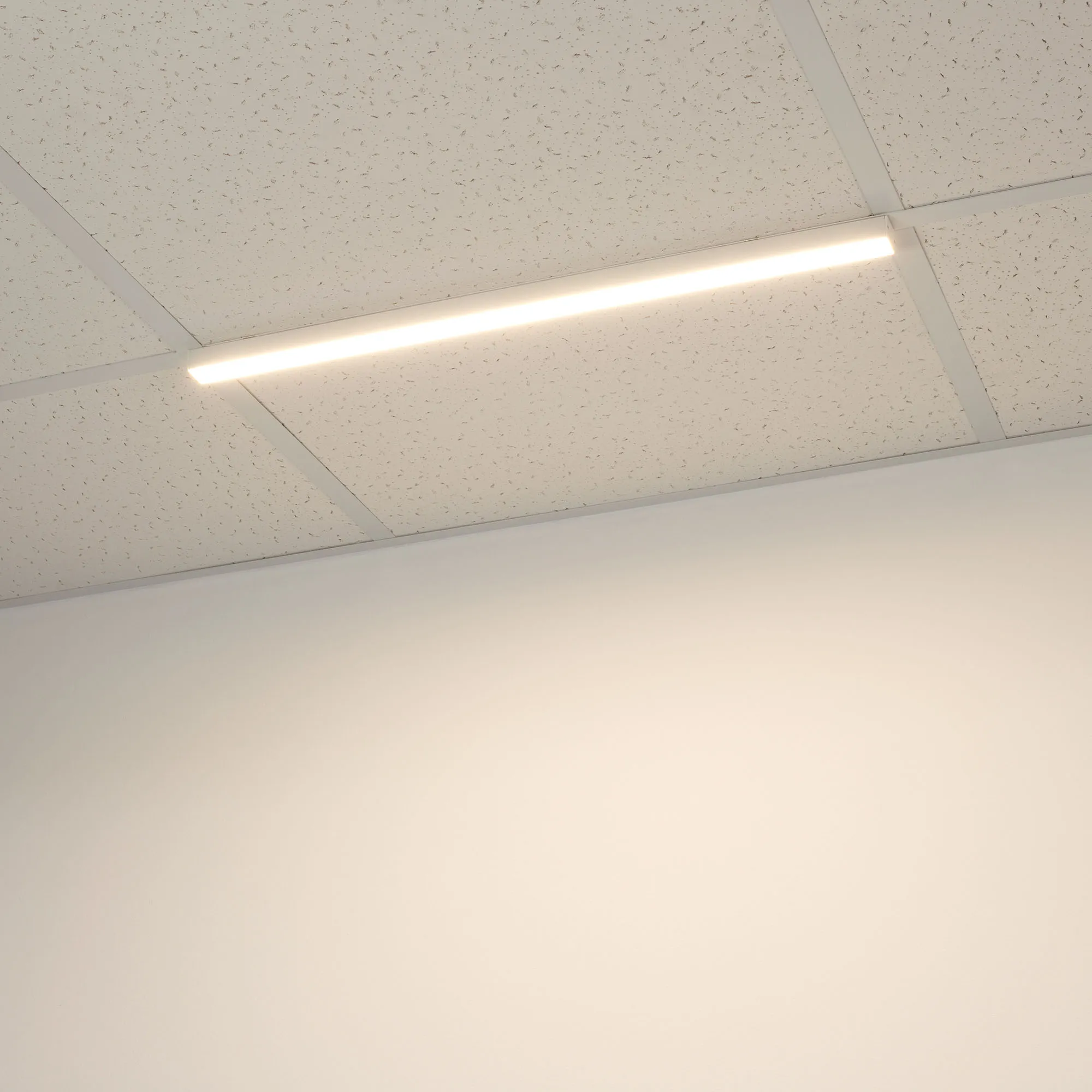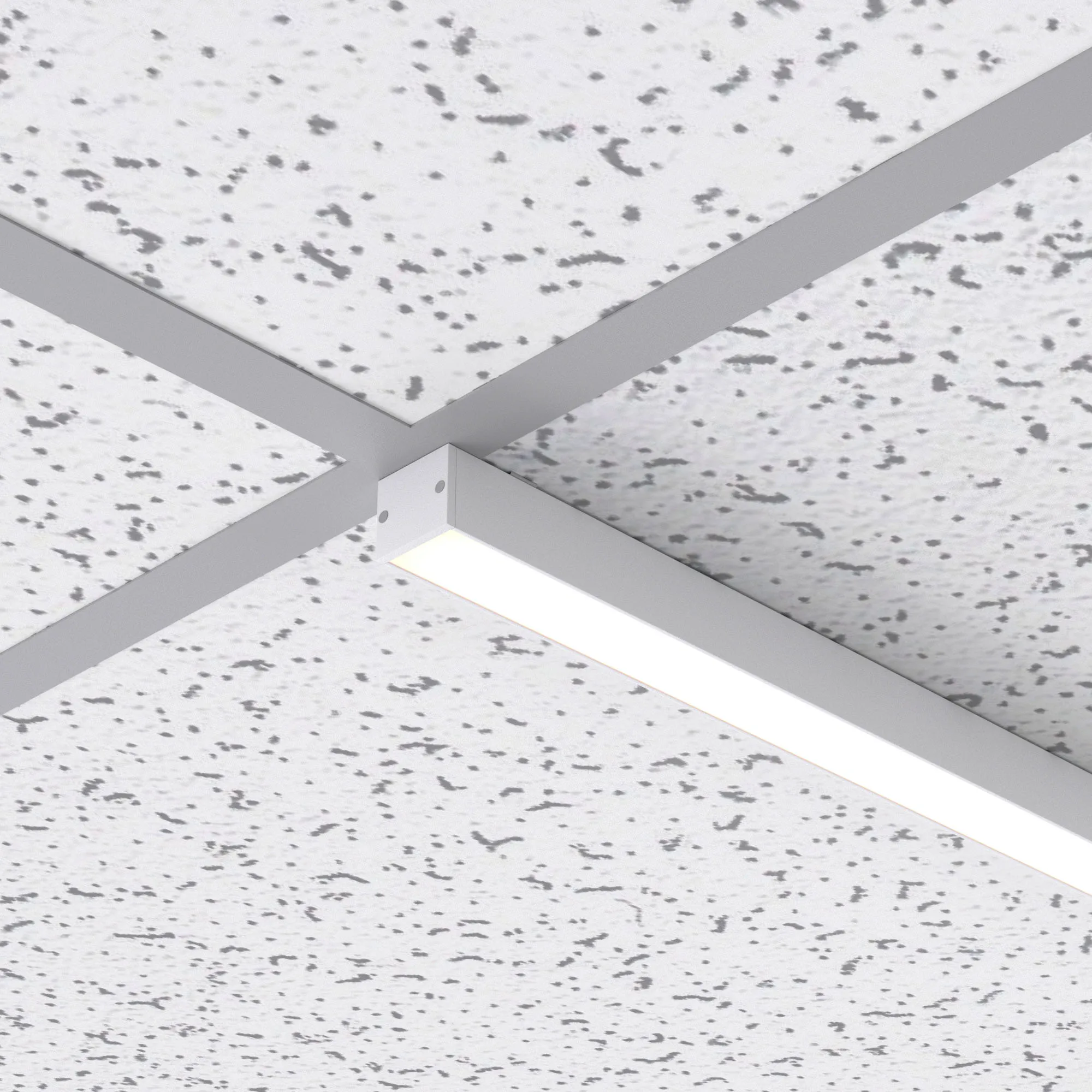 Под заказ от 500 шт. Светодиодный светильник для направляющих потолка Армстронг шириной 15 и 24 мм. Мощность 14 Вт, св. поток 1000 лм, 70 лм/Вт, теплый 3000K, CRI>80, угол 120°, напряжение питания 48 В. Белый квадратный корпус из алюминия, экран PS, степень защиты IP40. Размер: длина 600 мм, ширина 25 мм, высота 28 мм. Монтаж накладной. Драйвер поставляется отдельно.