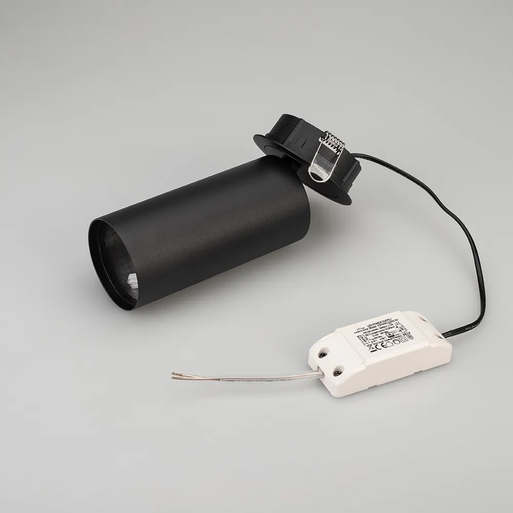 Корпус встраиваемый откидной для светильника POLO-R65 (1 часть из 3). Материал корпуса черный алюминий. Размер DxH Ø65x174мм, встроенный драйвер PRI:220-240VAC, SEC:DC 200mA 30-43V, 8Вт. Установка в отверстие Ø75мм.