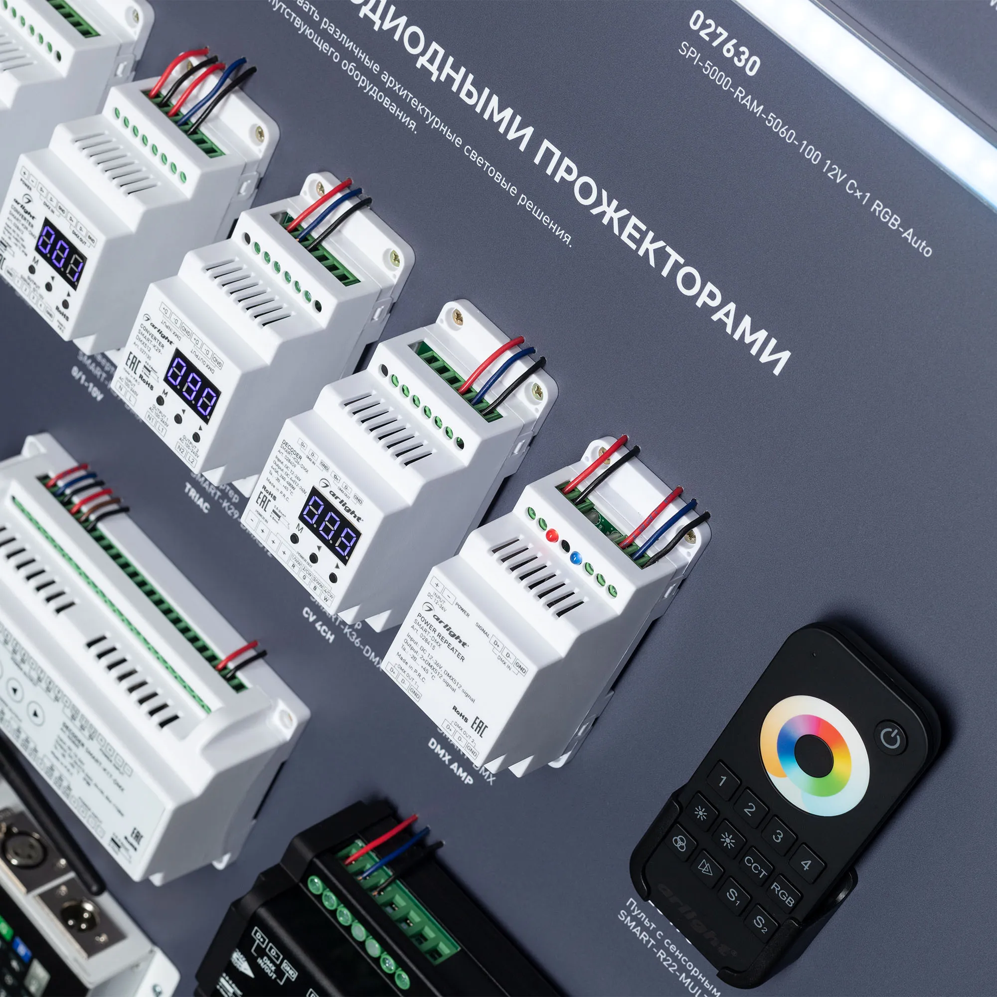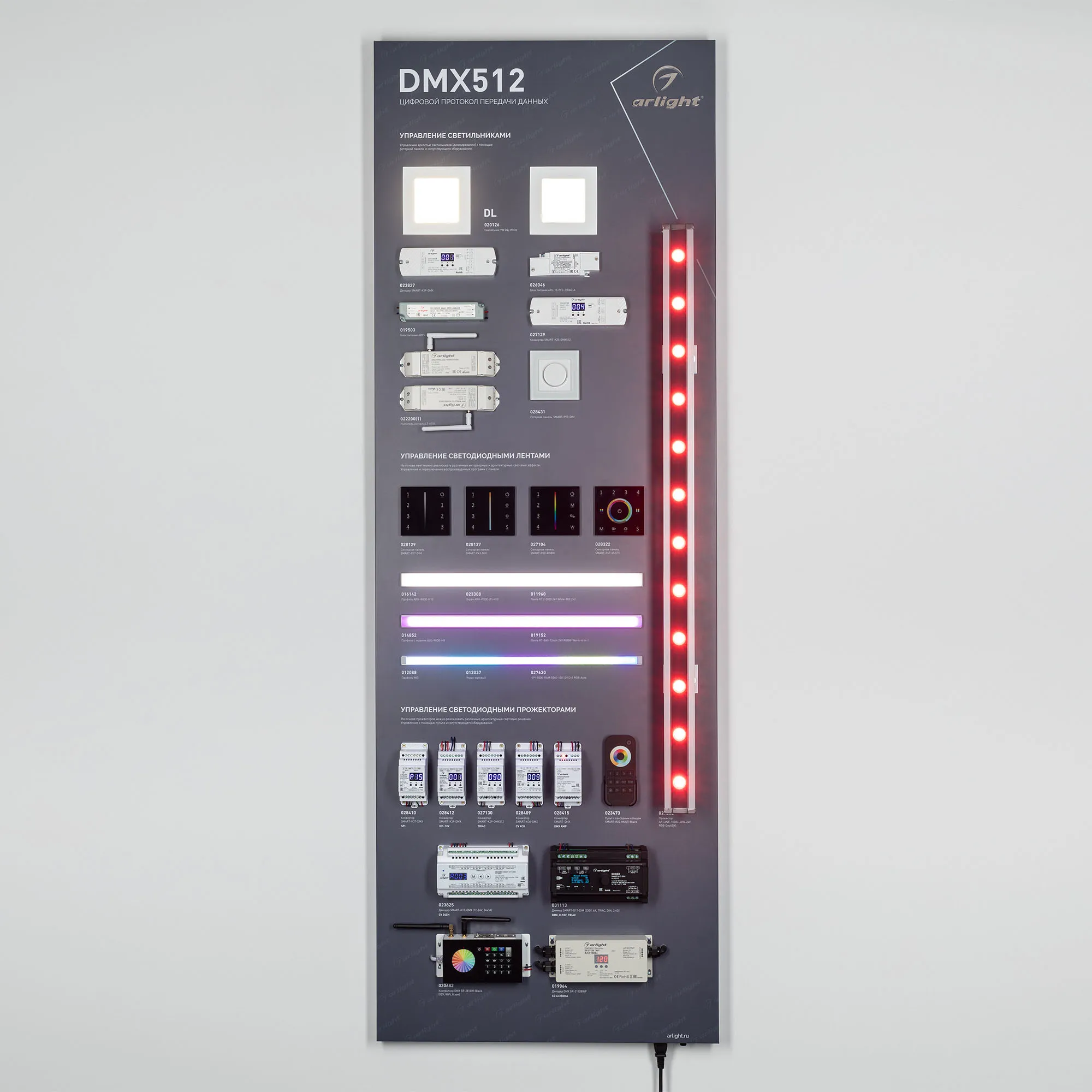 Наши специалисты знают все о продукции Arlight и с радостью помогут Вам выбрать комплектующие к товару "Стенд Управление светильниками DMX512 E34 1760x600mm (DB 3мм, пленка, лого) (Arlight, -)", или другие товары из раздела "Управление светом".