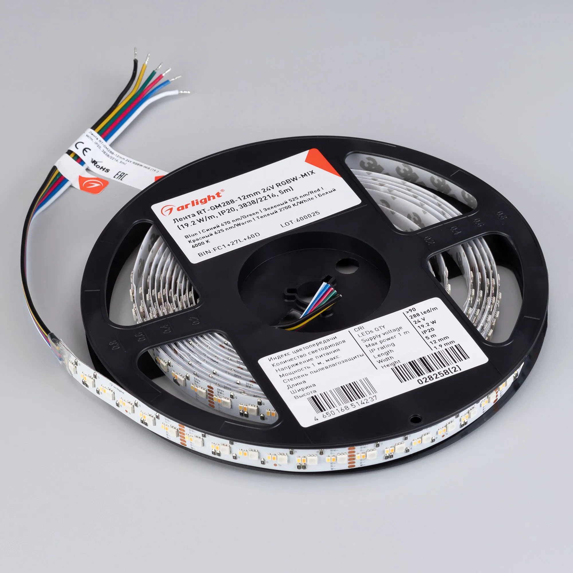 Лента светодиодная RT-GM288-12mm 24V RGBW-MIX (19.2 W/m, IP20, 3838/2216, 5m) (Arlight, Открытый)