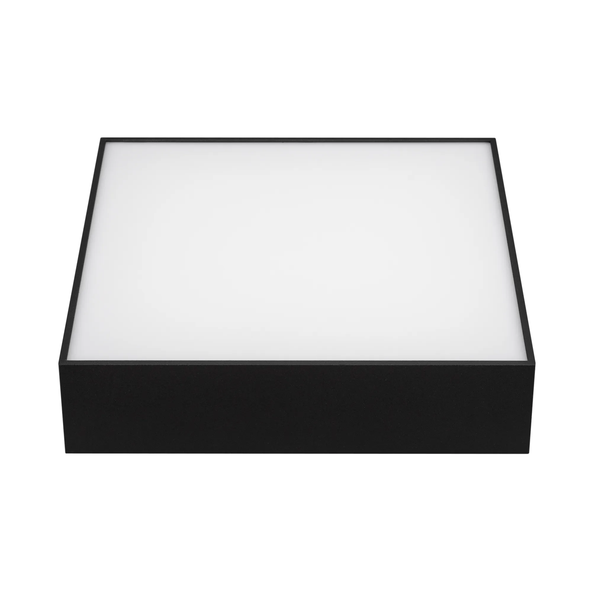 Накладной светильник. Мощность 25 Вт, св. поток 1440-1900 лм, 76 лм/Вт, дневной 4000 K, CRI>90, угол 120°, напряжение питания 230 В. Черный квадратный корпус из алюминия, экран PC, степень защиты IP40. Размер: длина 250 мм, ширина 250 мм, высота 59 мм. Монтаж накладной. Драйвер 27-45 В, 600 мА, пульсация <5%.