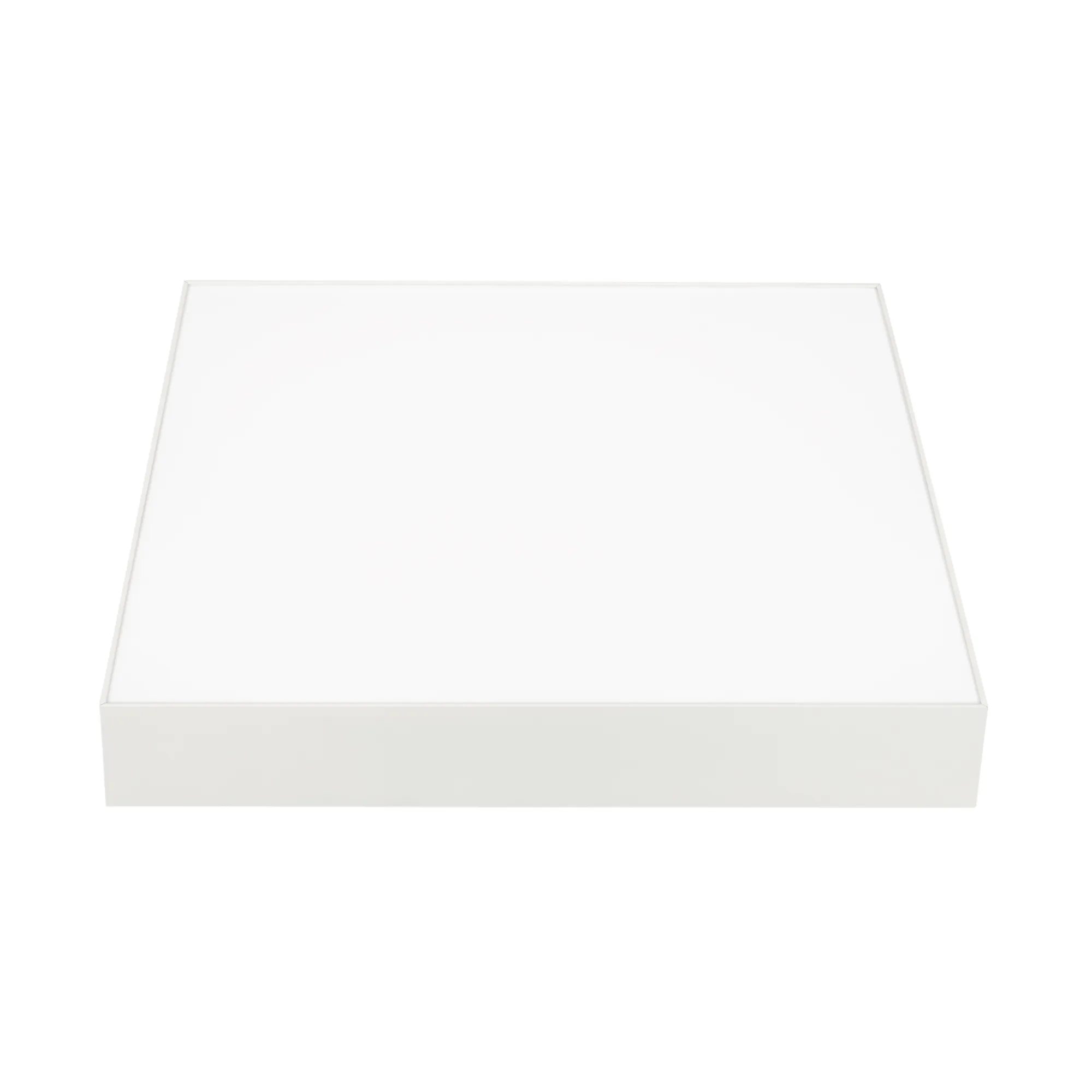 Накладной светильник. Мощность 40 Вт, св. поток 2590-3200 лм, 80 лм/Вт, дневной 4000 K, CRI>90, угол 120°, напряжение питания 230 В. Белый квадратный корпус из алюминия, экран PC, степень защиты IP40. Размер: длина 400 мм, ширина 400 мм, высота 64 мм. Монтаж накладной. Драйвер 27-40 В, 1000 мА, пульсация <5%.