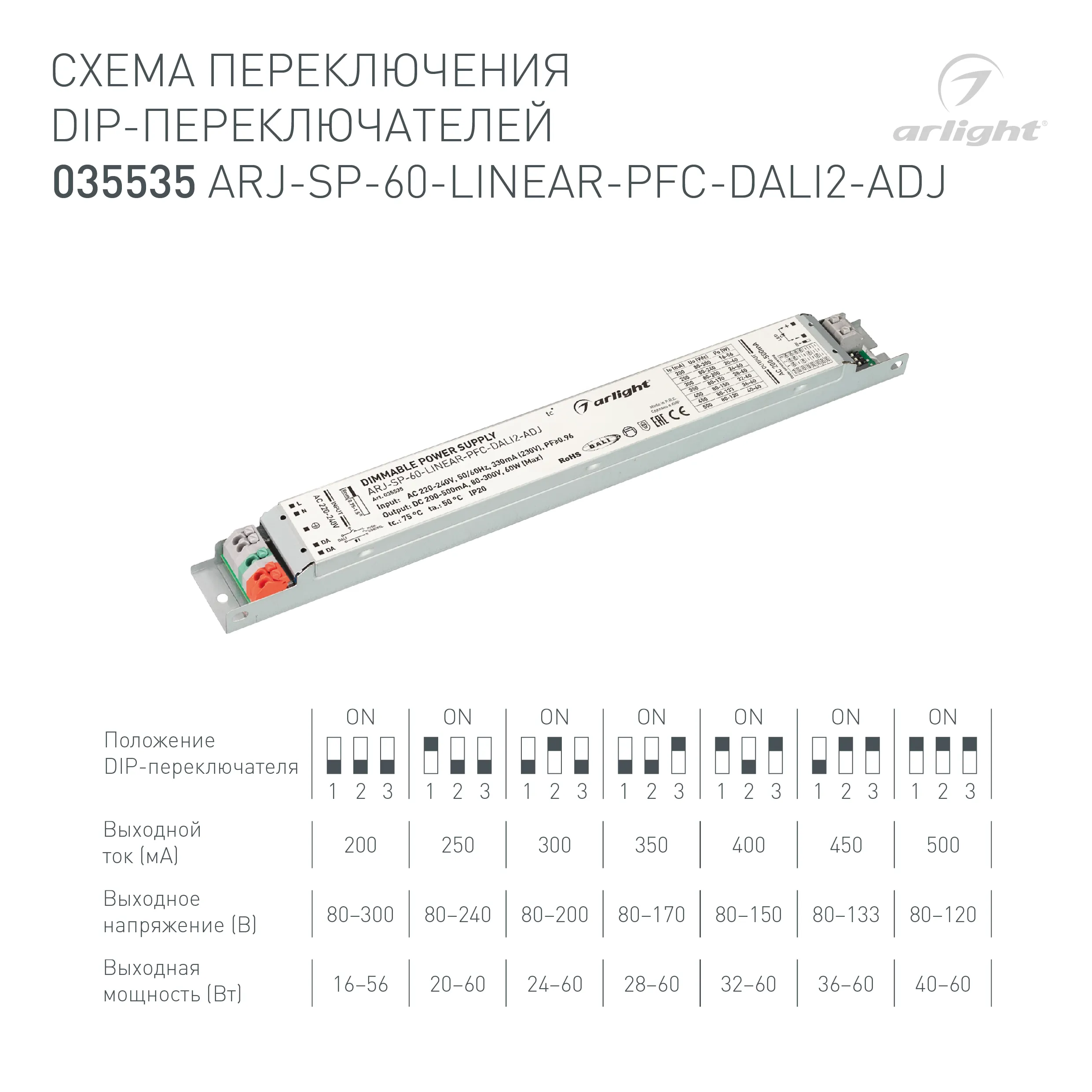 Блок питания ARJ-SP-60-LINEAR-PFC-DALI2-ADJ (60W, 80-300V, 0.2-0.5A) (Arlight, IP20 Металл, 5 лет)