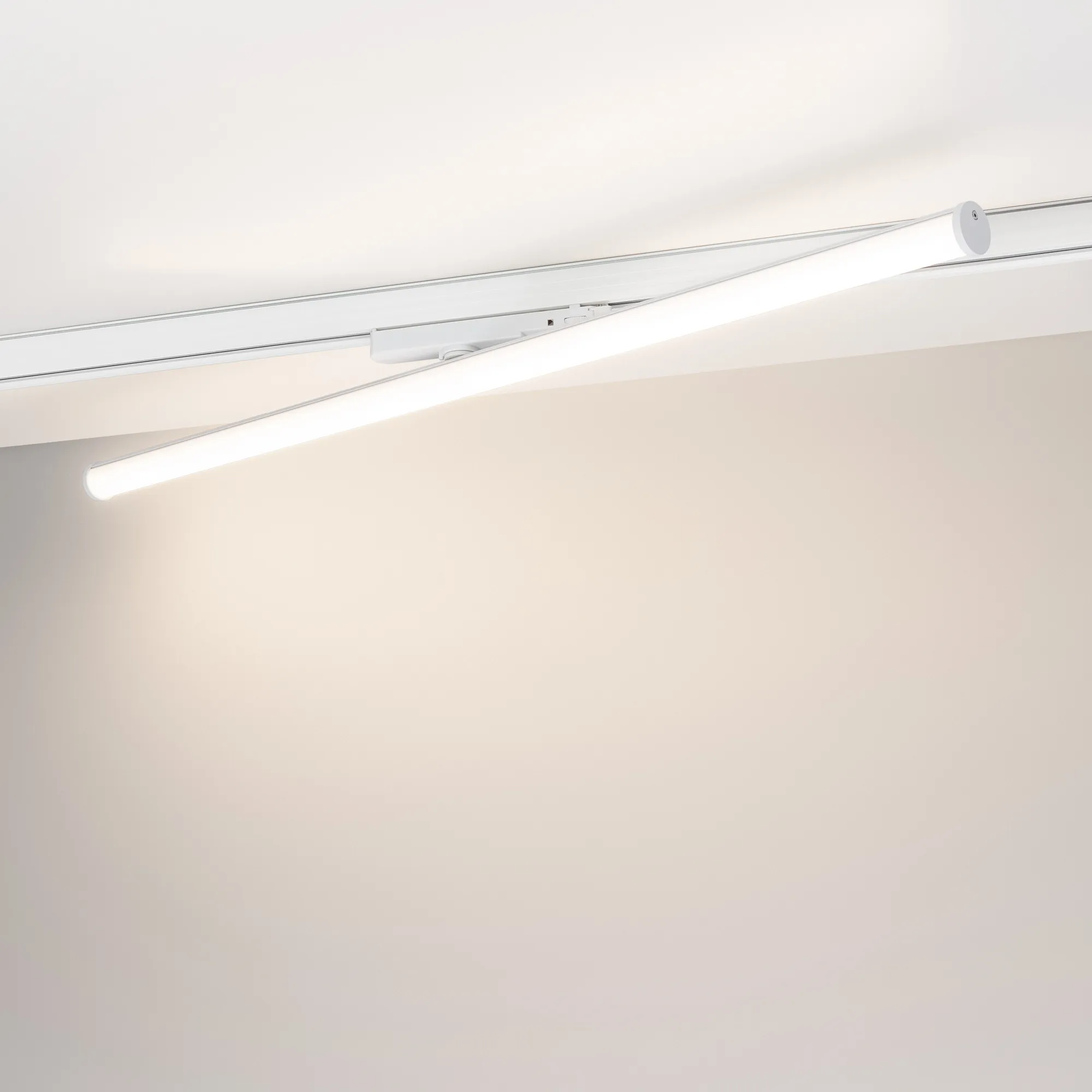 Светильник подвесной для треков/шин 4 провода. Мощность 30 Вт, св. поток 2660 лм, 90 лм/Вт, дневной 4000 K, CRI>90, угол 180°, напряжение питания 230 В. Белый фигурный корпус из алюминия, экран поликарбонат, степень защиты IP20. Размер: диаметр 30 мм, длина 900 мм, высота 81 мм. Монтаж на трек 3-фазный. Драйвер 20-43 В, 700 мА, пульсация <1%.