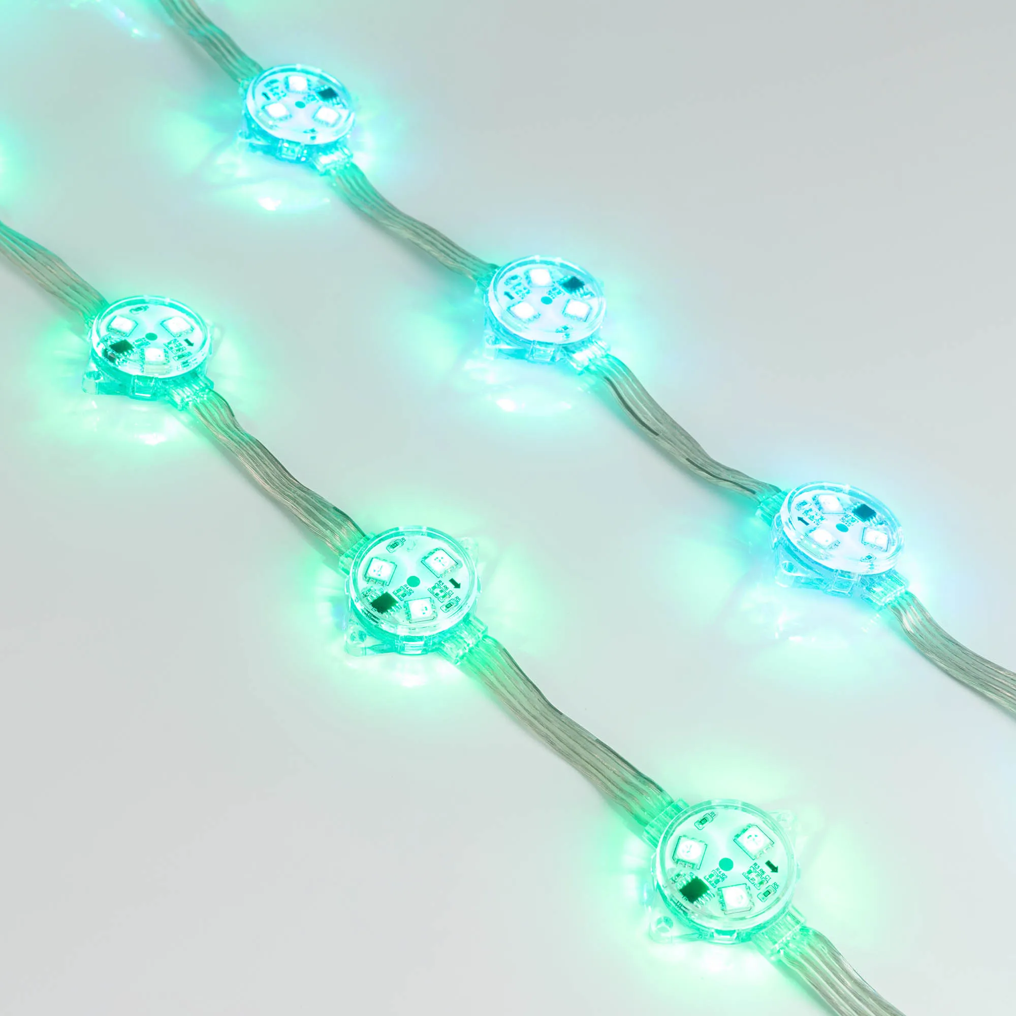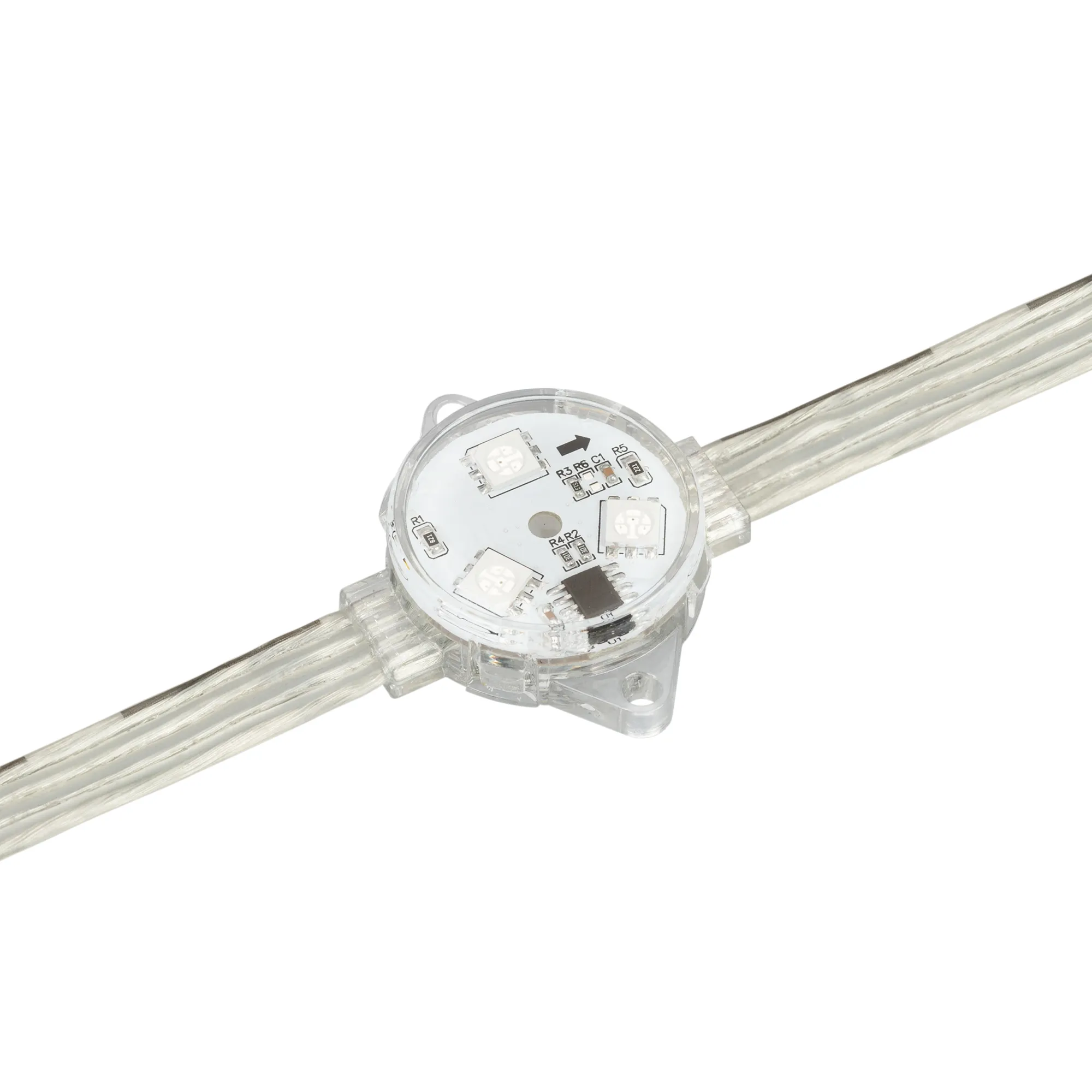Управляемый светодиодный модуль DMX, RGB, микросхема DMX512 (UCS512), напряжение 12 В, мощность 0.72 Вт, 3 светодиода SMD 5060, угол 140°. Создание медиафасадов, 20 шт на проводе, расстояние между центрами модулей 100 мм, длина провода между модулями 60 мм. Степень пылевлагозащиты IP68. Размер Ø30×11 мм. Гарантия 3 года.