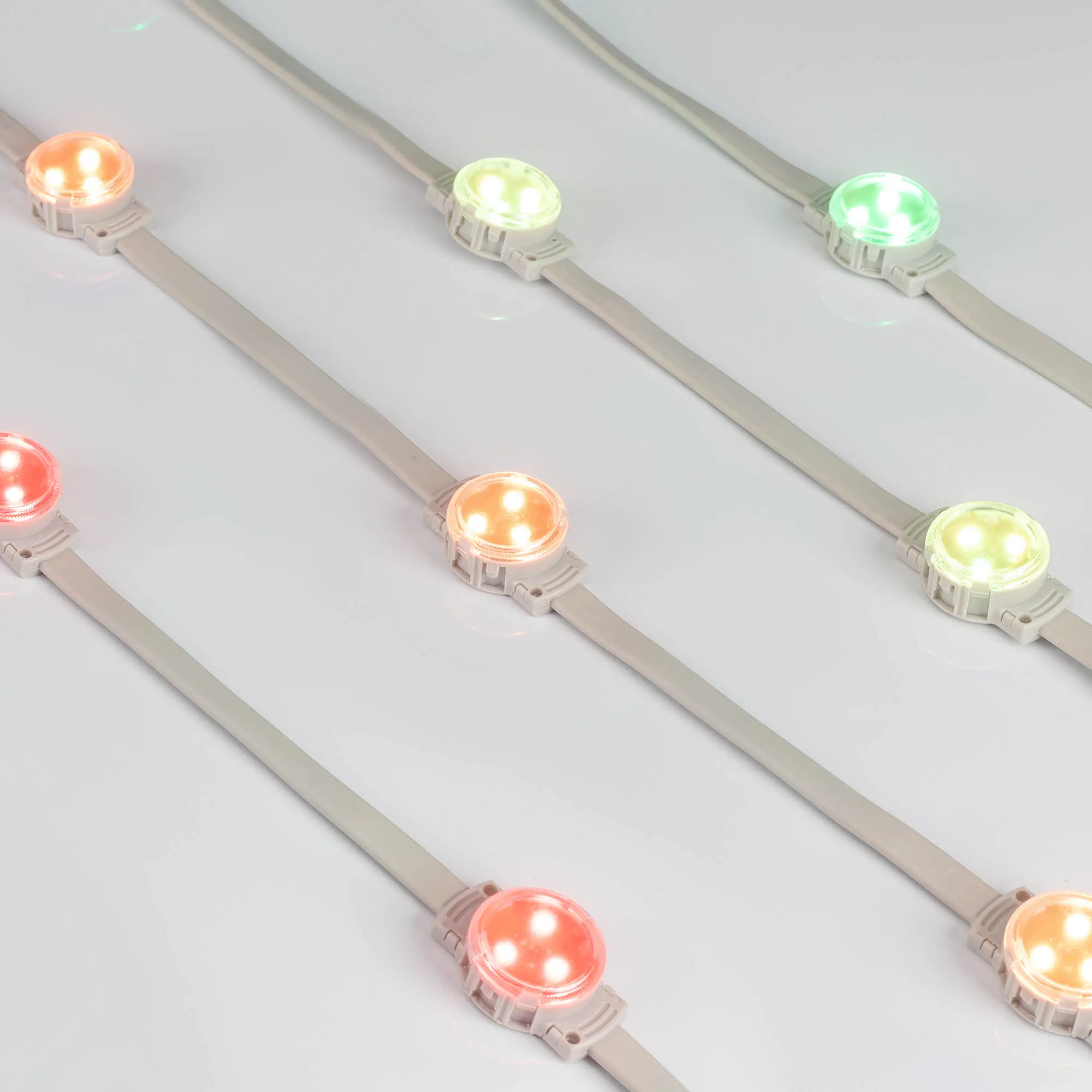 Управляемый светодиодный модуль DMX, RGB, микросхема SM16511, напряжение 12 В, мощность 0.75 Вт, 3 светодиода SMD 3535, угол 120°. Создание медиафасадов, 30 шт на проводе, расстояние между центрами модулей 170 мм, длина провода между модулями 125 мм. Степень пылевлагозащиты IP68. Размер Ø30×44×16 мм. Гарантия 3 года.