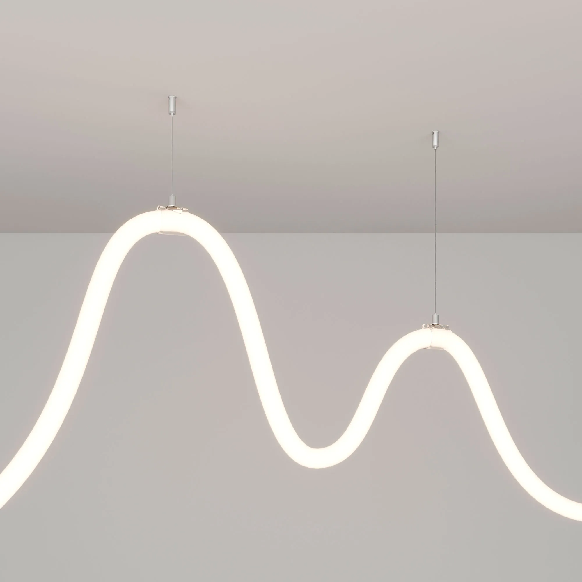 Горизонтальный подвес для герметичной ленты MOONLIGHT-D25. Длина тросов 2м. Подходит для любых потолочных поверхностей. Совместим с прозрачными трубками с боковым выводом кабеля (см.совместимые).