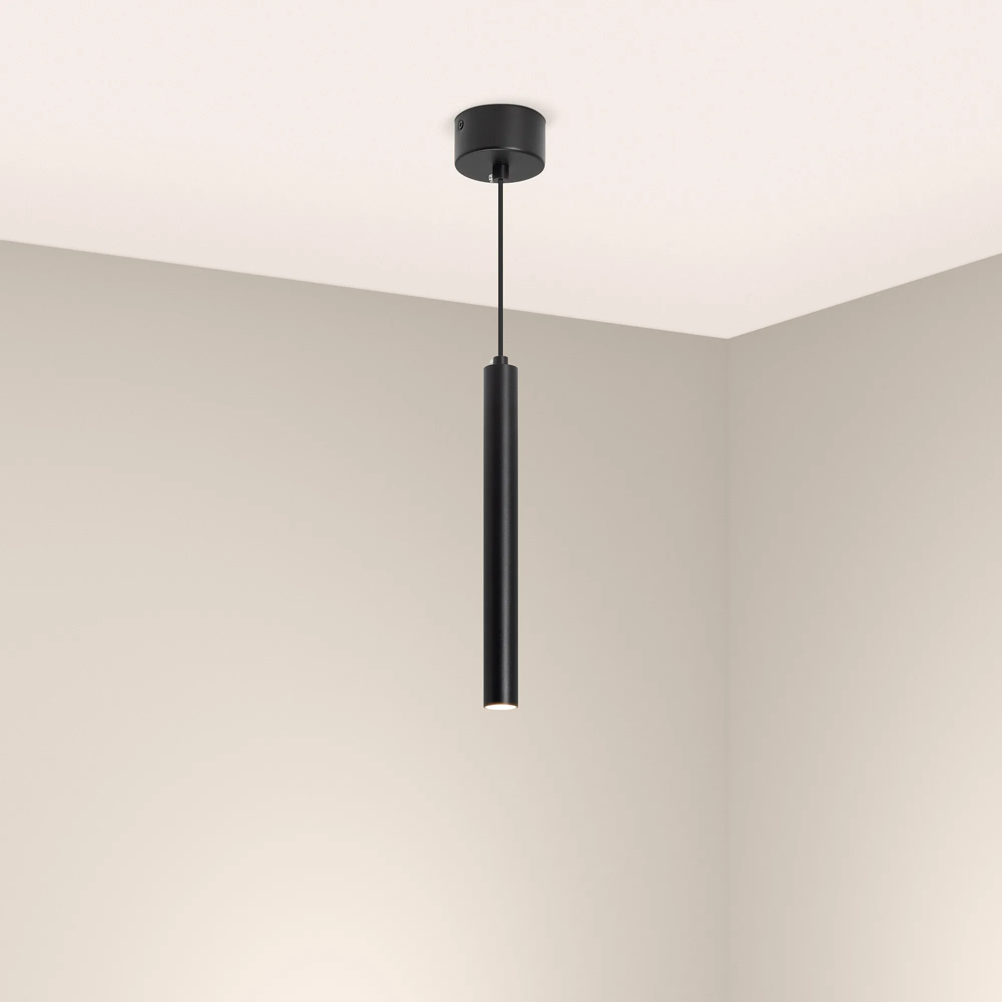 Подвесной светильник. Мощность 9 Вт, св. поток 561 лм, 64 лм/Вт, дневной 4000 K, CRI>90, угол 24°, напряжение питания 230 В. Черный круглый корпус из алюминия, рассеиватель PC, степень защиты IP20. Размер: диаметр 30 мм, длина 300 мм, размер чаши: диаметр 80 мм, высота 40 мм. Монтаж подвесной, длина подвеса 1500 мм. Драйвер 28-42 В, 200 мА, пульсация <1%.