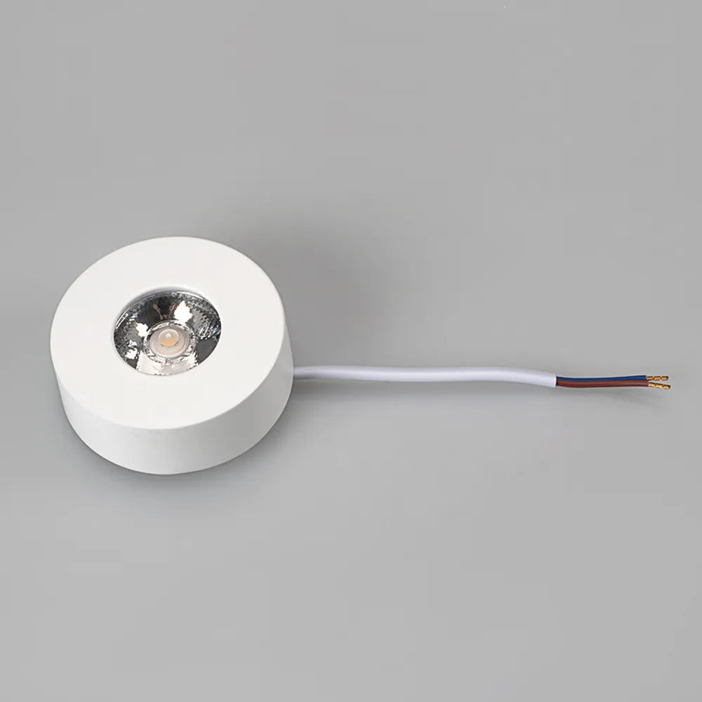 Накладной круглый мебельный светильник 5Вт, корпус белый алюминий. Цвет ТЕПЛЫЙ БЕЛЫЙ 3000K. Светодиод 1х5W. CRI>80, Св.поток 350-400лм, угол 10°. Питание 180-240VAC, 5Вт, 400mA 11-14V, драйвер встроенный. Размеры d70x25 мм.