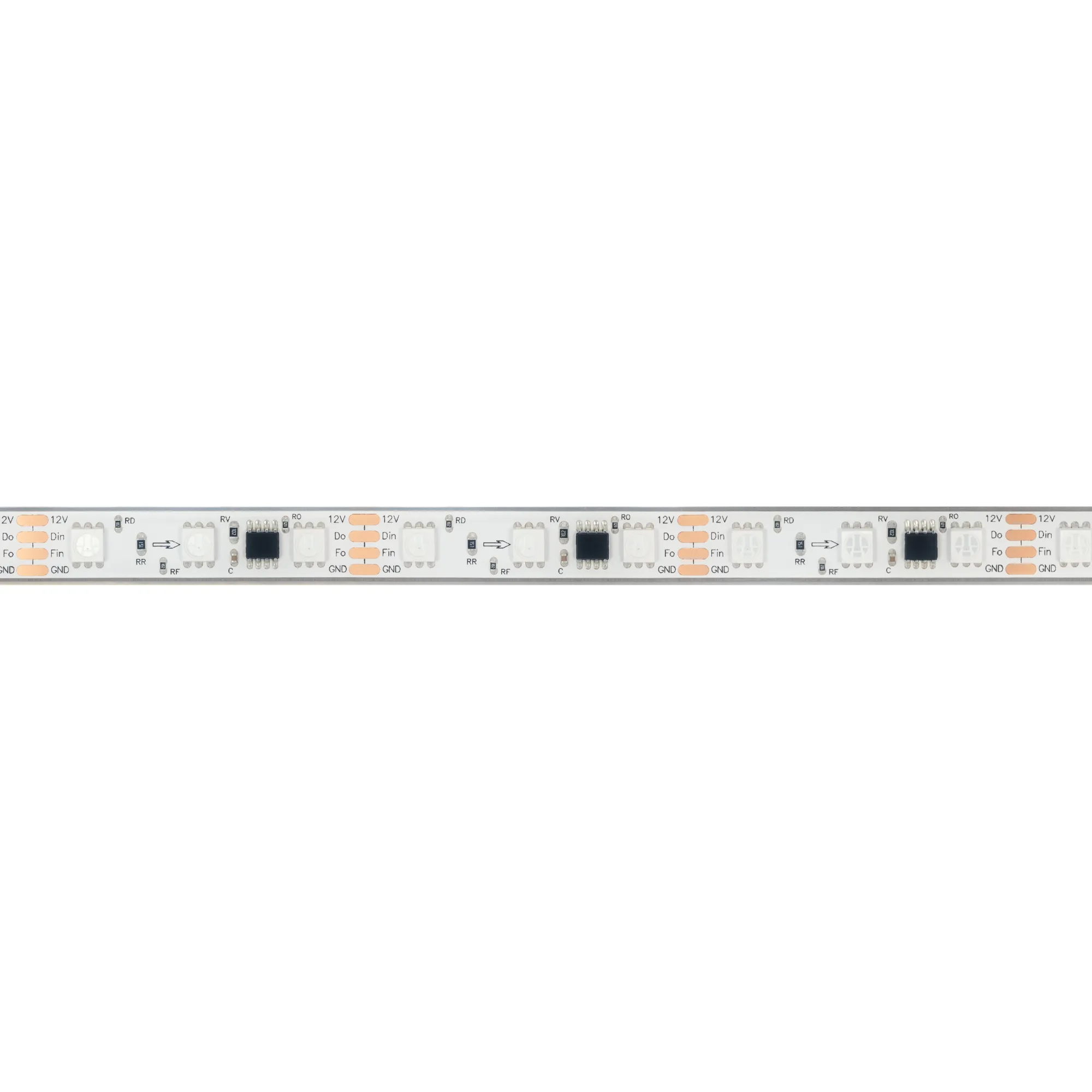 Светодиодная герметичная лента SPI серии B60 с микросхемой MT1808A, IP68 (PFS - полная силиконовая экструзия). Светодиоды SMD 5060, 60 шт/м, 20 pixels на 1 м (100 pixels на 5 м), 1 pixel = 3 светодиода, белая плата шириной 10 мм, скотч 3М. Цвет RGB, угол 120°. Питание 12 В, мощность 12 Вт/м (60 Вт на 5 м). Размеры 5000x12x5 мм. Мин. отрезок 50 мм, 3 светодиода. Цена за 1 м.