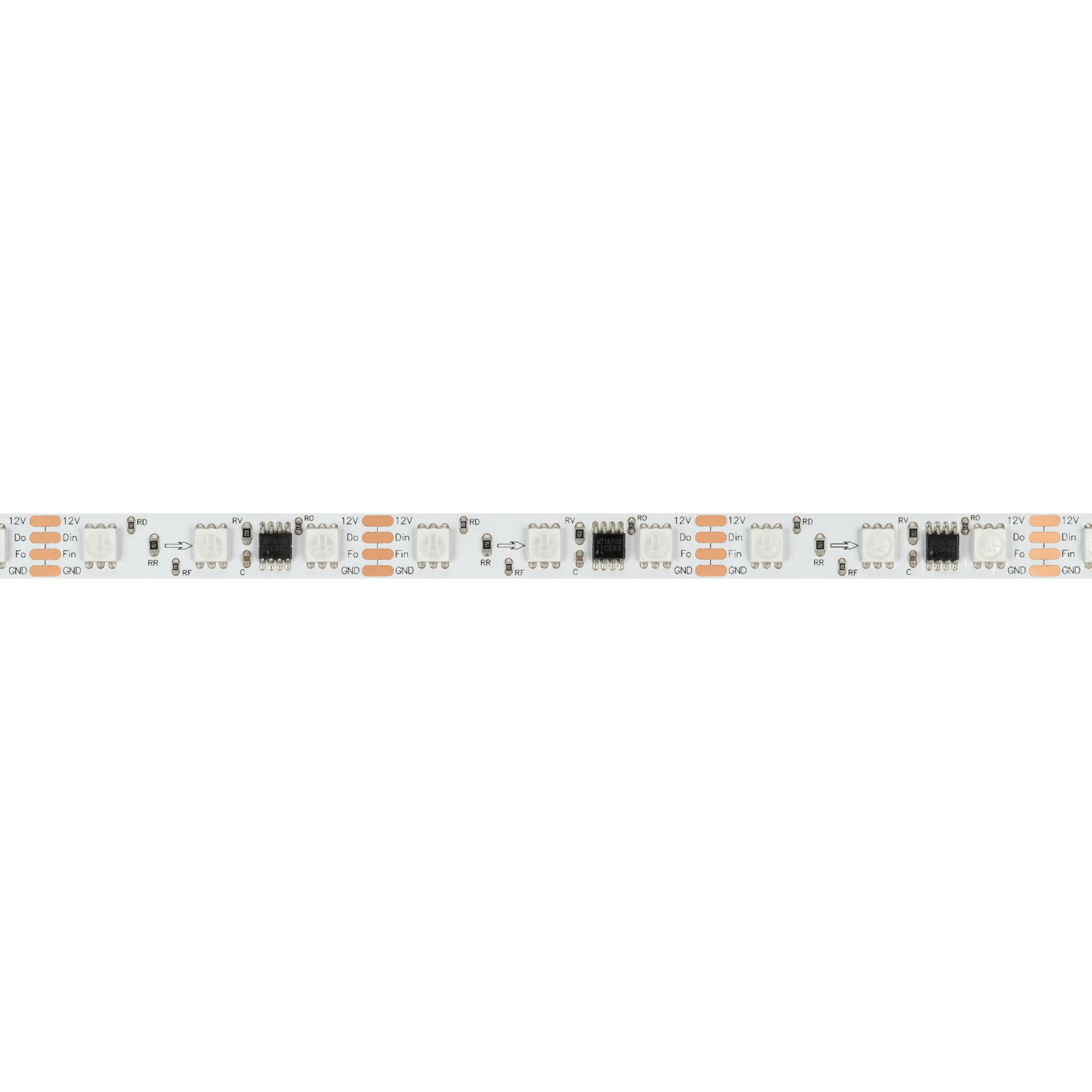 Светодиодная лента SPI серии B60 с микросхемой MT1808A. Светодиоды SMD 5060, 60 шт/м, 20 pixels на 1 м (100 pixels на 5 м), 1 pixel = 3 светодиода, белая плата шириной платы 10 мм, скотч 3М. Цвет RGB, угол 120°. Питание 12 В, мощность 12 Вт/м (60 Вт на 5 м). Размеры 5000x10x2 мм. Мин. отрезок 50 мм, 3 светодиода. Цена за 1 м.