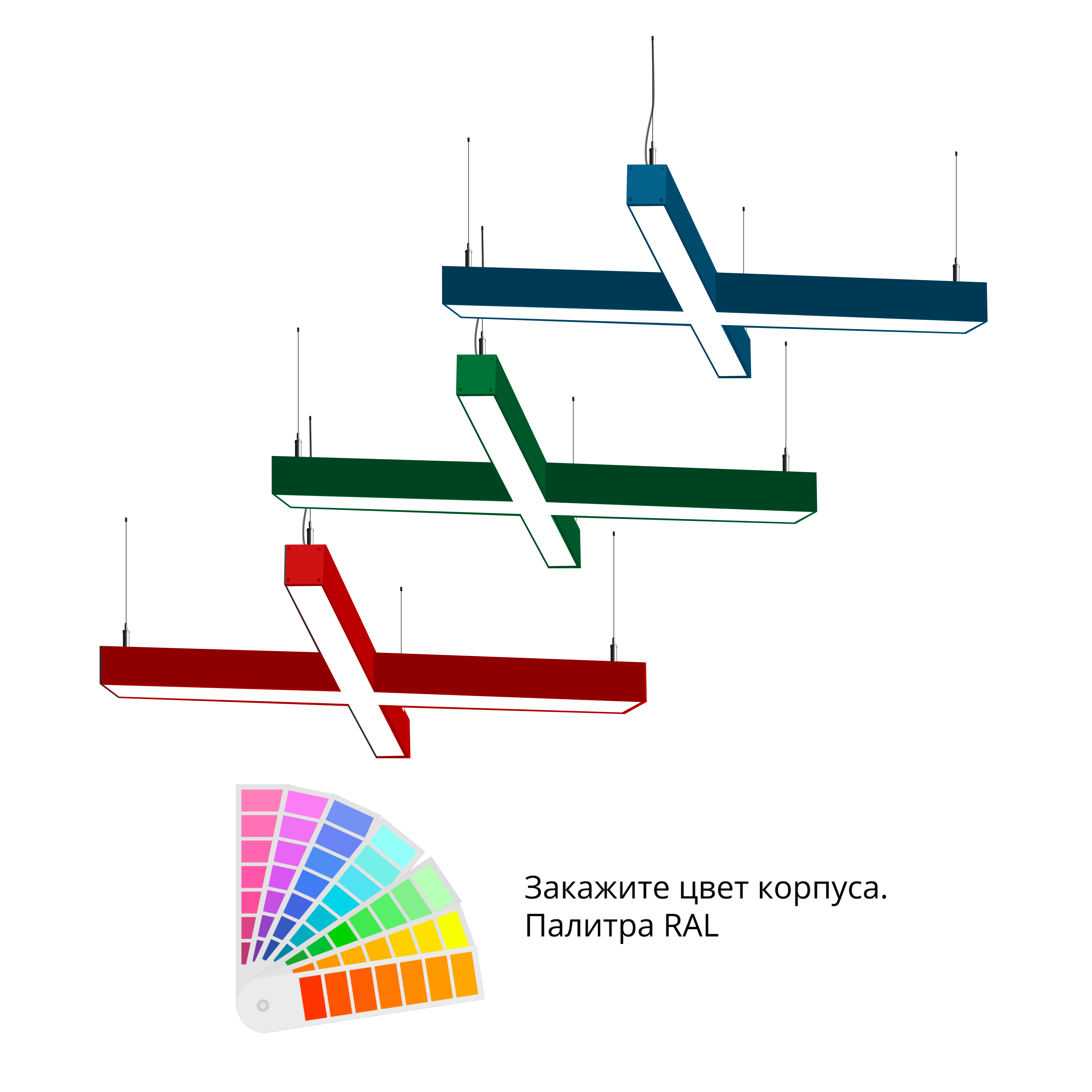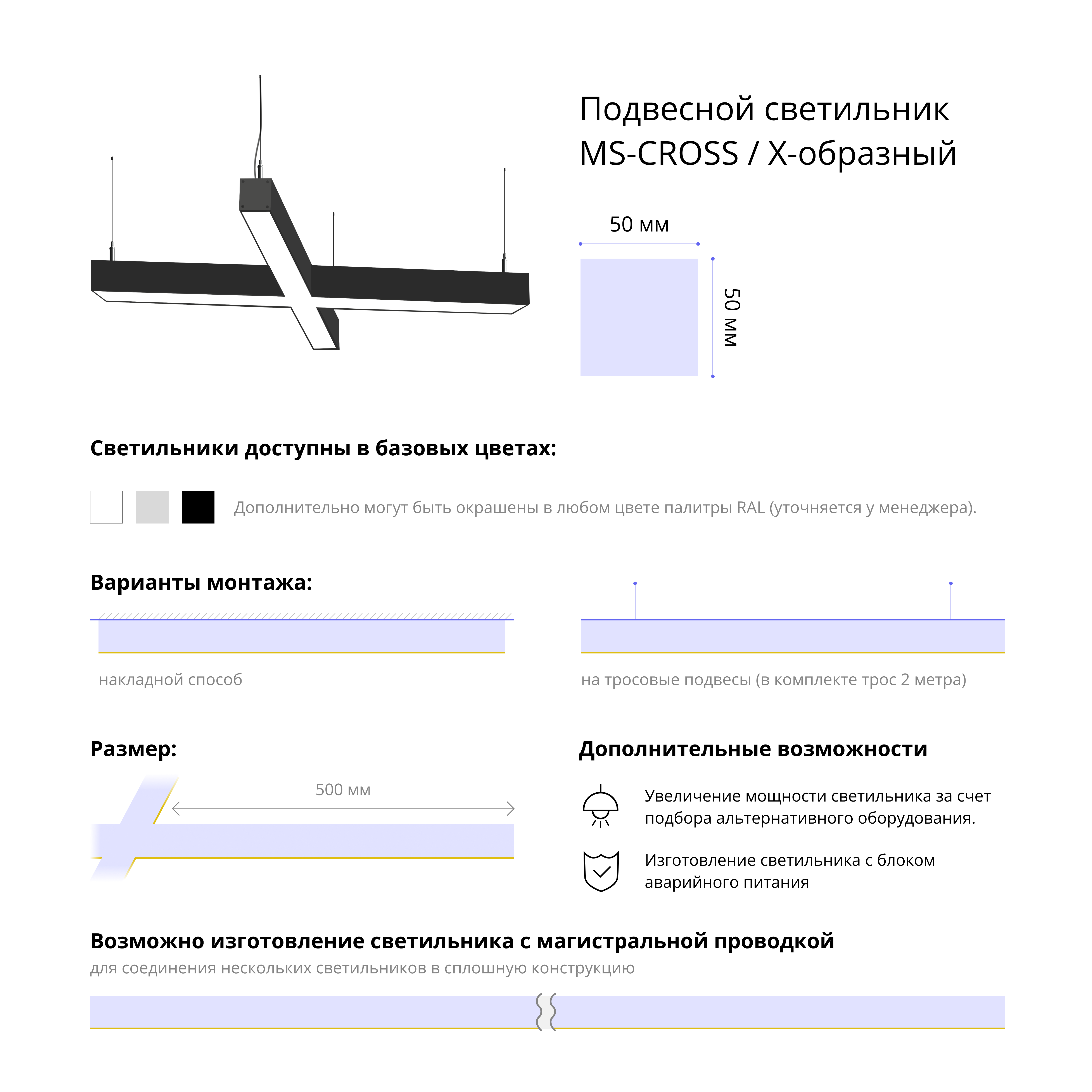 Cветодиодный фигурный светильник MS-CROSS X-образный размер профиля 50x50мм длиной 4х500мм мощностью 80W. Светильник собирается из алюминиевого основния с матовым рассеивателем, который дает равномерную засветку по всей площади.