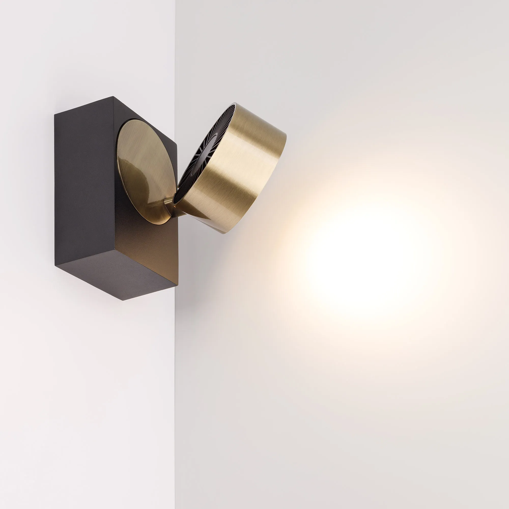 Светильник накладной поворотный. Мощность 9 Вт, св. поток 550 лм, 61 лм/Вт, теплый 3000 K, CRI>90, угол 36°, напряжение питания 230 В. Модуль Цвета Темная Латунь, Черный прямоугольный корпус из алюминия, экран поликарбонат, степень защиты IP20. Размер: длина 110 мм, ширина 77 мм, высота 93 мм. Монтаж накладной. Драйвер 38 В, 200 мА, пульсация <1%.