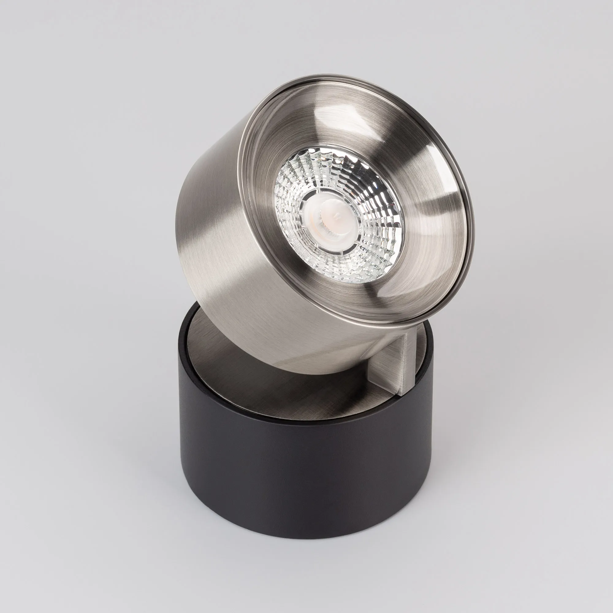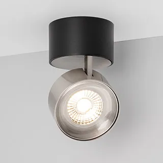 Светильник накладной поворотный. Мощность 9 Вт, св. поток 550 лм, 61 лм/Вт, теплый 3000 K, CRI>90, угол 36°, напряжение питания 230 В. Модуль Цвета Никель, Черный круглый корпус из алюминия, экран поликарбонат, степень защиты IP20. Размер: диаметр 77 мм, высота 92 мм. Монтаж накладной. Драйвер 38 В, 200 мА, пульсация <1%.
