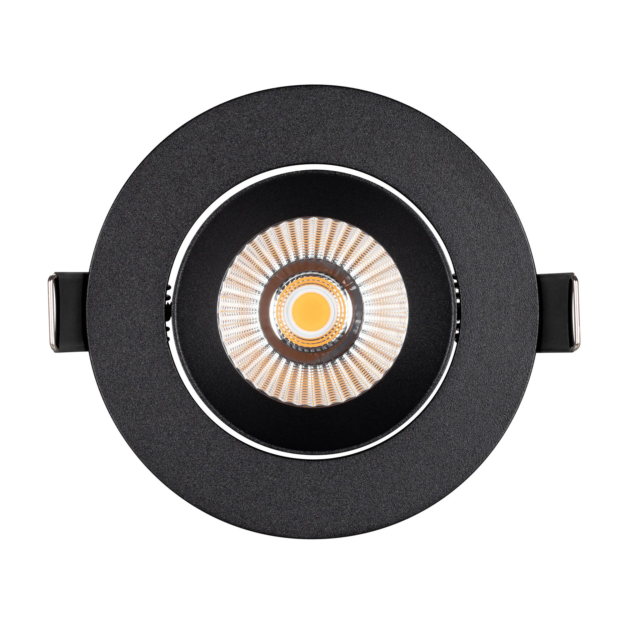 Встраиваемый поворотный светильник даунлайт. Мощность 10 Вт, св. поток 910 лм, 90 лм/Вт, дневной 4000 K, CRI>90, угол 36°, напряжение питания 230 В. Чёрный круглый корпус из алюминия, экран PMMA, степень защиты IP54. Размер: диаметр 94 мм, высота 75 мм. Монтаж встраиваемый, установочное отверстие: диаметр 77 мм. Драйвер IP54, 20-40 В, 250 мА, пульсация <1%.