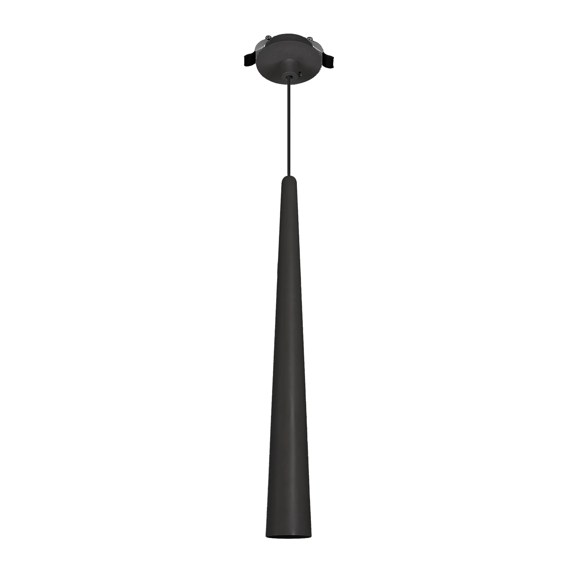 Подвесной светильник. Мощность 5 Вт, св. поток 400 лм, световая эффективность 70 лм/Вт, теплый 2700 K, CRI>92, угол 36°, напряжение питания 230 В. Чёрный конусообразный вытянутый корпус из алюминия, линза из PMMA, степень защиты IP20. Размер: диаметр 57 мм, высота 400 мм. Монтаж подвесной, длина подвеса 2000 мм, регулируемая. В комплекте 2 вида чаш. Габариты встраиваемой чаши: Ø 80x41 мм. Габариты накладной чаши Ø80x60 мм. Драйвер 2,8-12В, 500 мА, пульсация <1%.