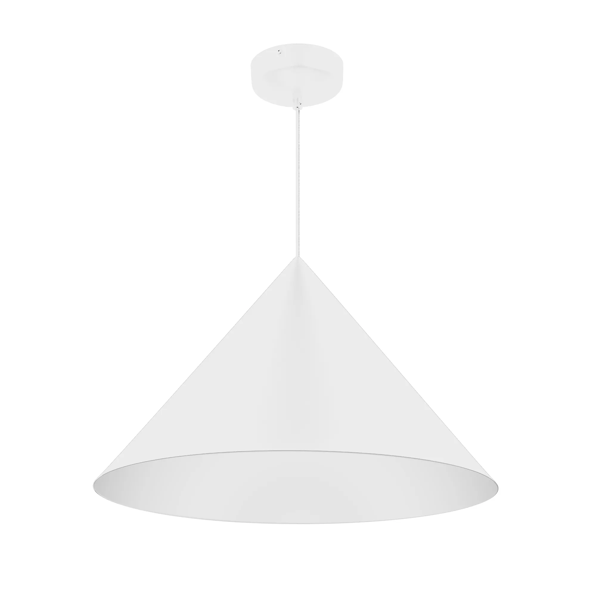 Подвесной светильник. Мощность 14 Вт, св. поток 1200 лм, 74 лм/Вт, тёплый 3000 K, CRI>92, угол 36°, напряжение питания 230 В. Белый корпус из алюминия в форме конуса с белой внутренней поверхностью, линза-рассеиватель из PMMA, степень защиты IP20. Размер: диаметр 550 мм, высота 340 мм. Монтаж подвесной, длина подвеса 2000 мм, регулируемая. В комплекте 2 вида чаш. Габариты встраиваемой чаши: Ø 80x23 мм. Габариты накладной чаши Ø140x55 мм. Драйвер 27-42 В, 350 мА, пульсация <1%. Управление по TRIAC.