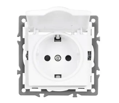 Механизм розетки с заземлением на 1 пост с влагозащитной крышкой, с суппортом из алюминия. Цвет - белый. Степень пылевлагозащиты - IP44.