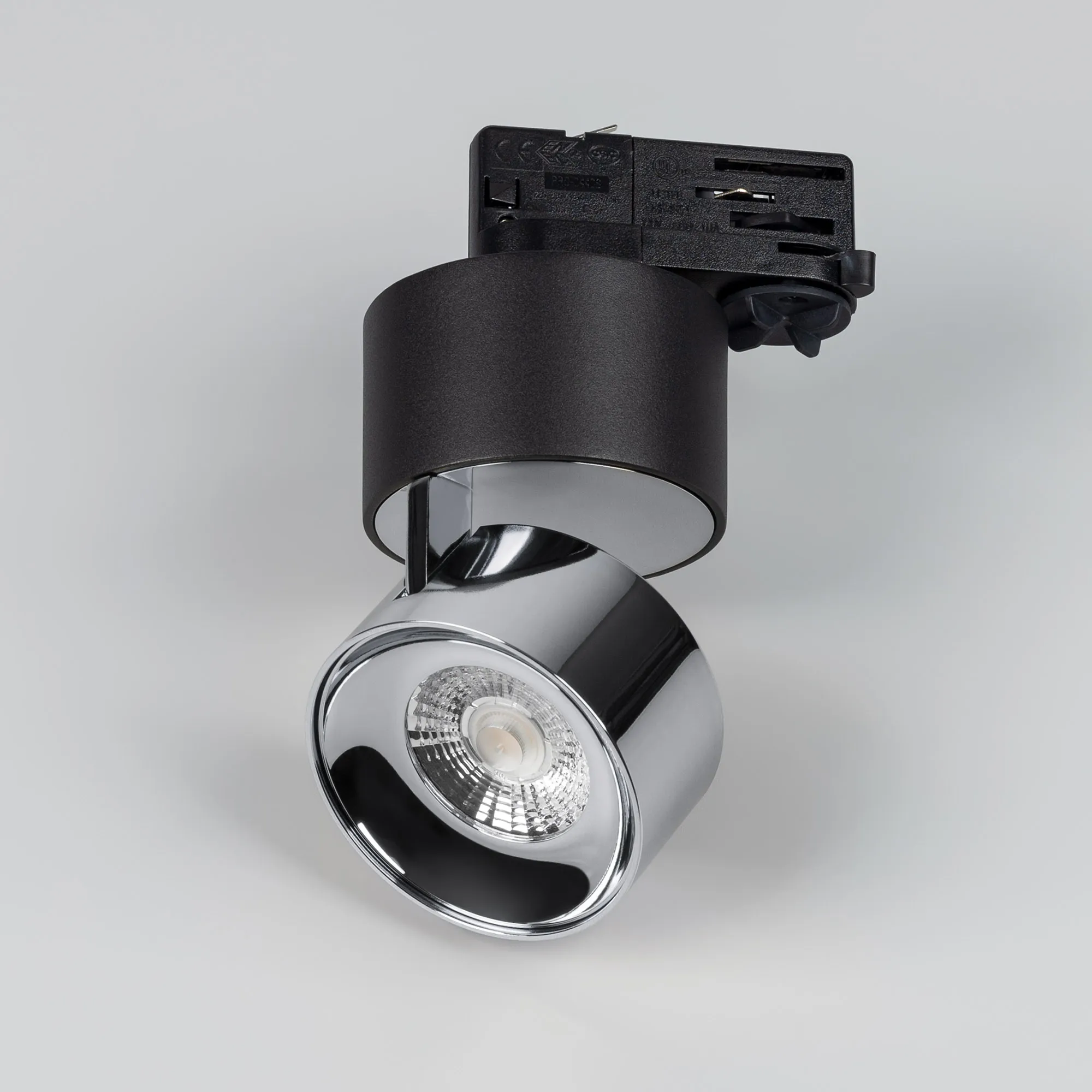 Светильник для треков/шин 4 провода. Мощность 9 Вт, св. поток 580 лм, 64 лм/Вт, дневной 4000 K, CRI>90, угол 36°, напряжение питания 230 В. Модуль цвета хром, черный круглый корпус из алюминия, степень защиты IP20. Размеры корпуса: длина адаптера 86 мм, ширина 32 мм, высота 38,2 мм., высота основания 46 мм. Размер светодиодного модуля: диаметр 77 мм, высота 59 мм. Монтаж на трек 3-фазный. Драйвер 38 В, 200 мА, пульсация <1%.
