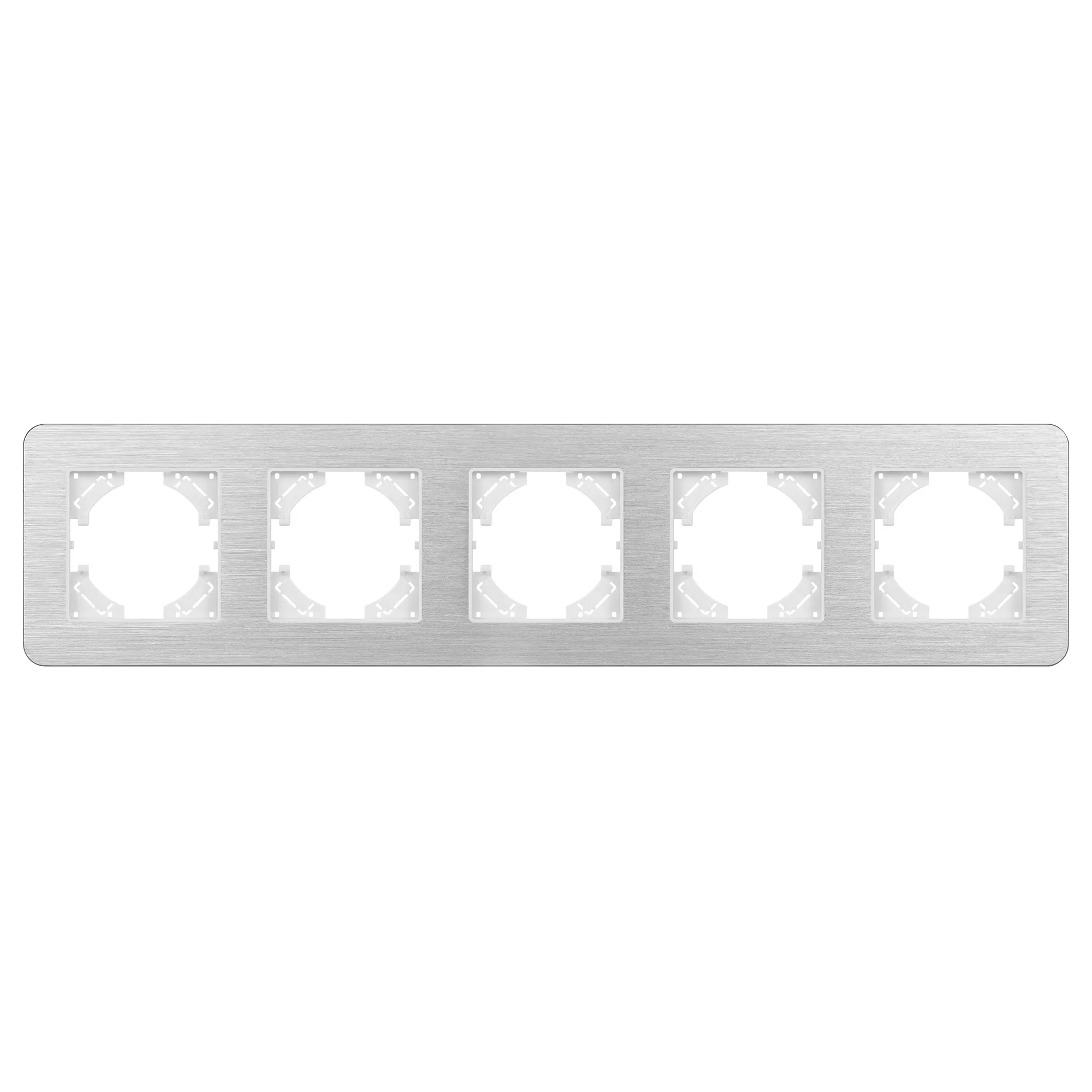 Рамка алюминиевая на 5 постов, под встраиваемый механизм. Цвет - серебристый. Уровень герметичности IP20. Ориентация монтажа - горизонтальная (основным ориентиром служат посадочные выступы для накладки механизма).
