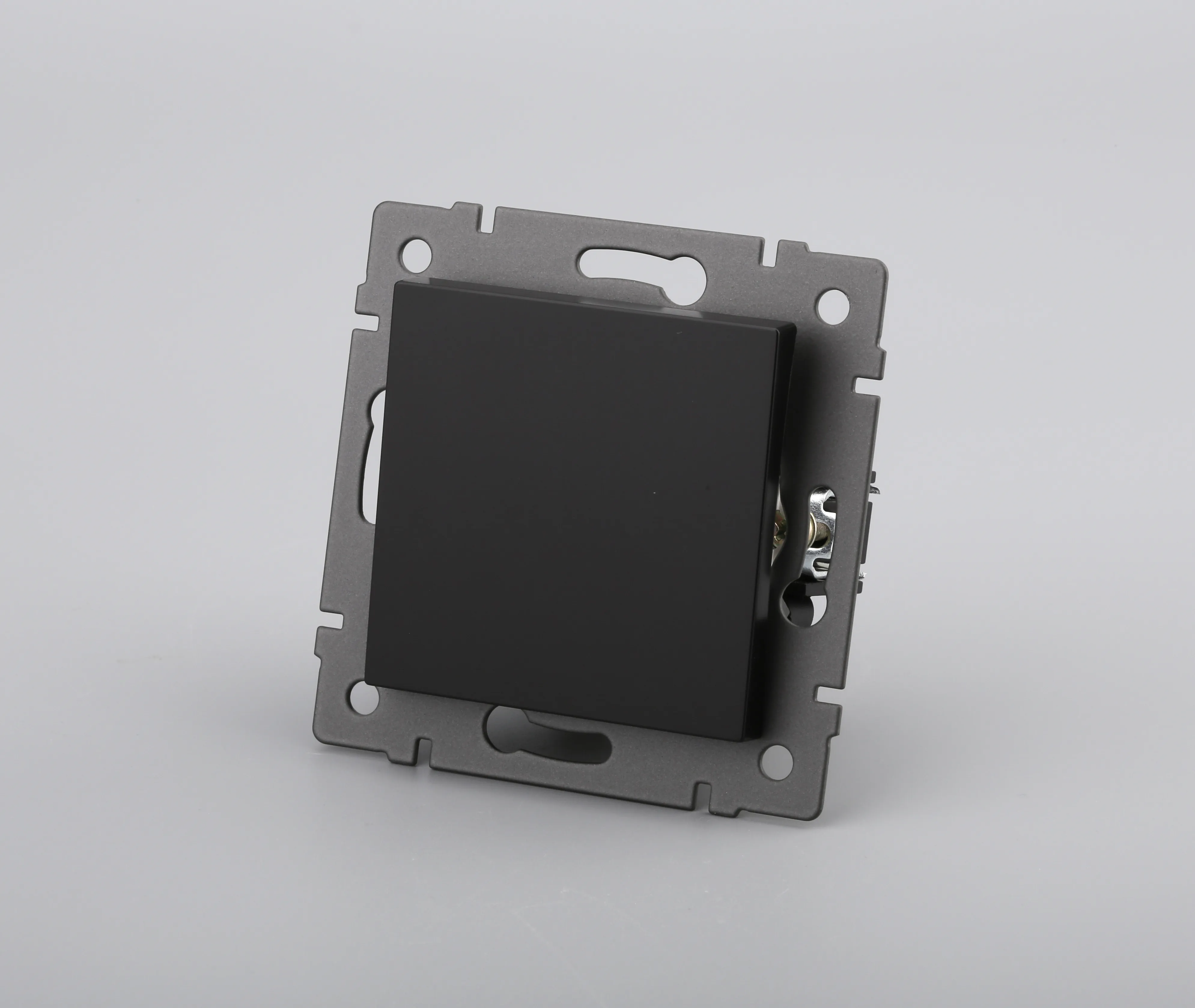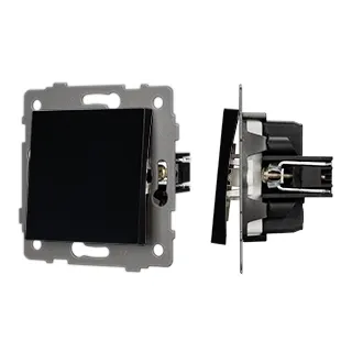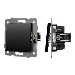Механизм выключателя света клавишный на 1 пост 1 клавиша (перекрестный). Цвет - черный. Без фронтальной рамки. Уровень пылевлагозащиты IP20. Выключатель устанавливается в стандартный круглый подрозетник.