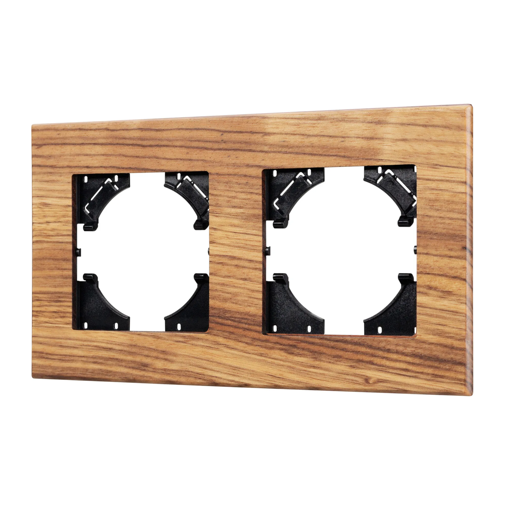 Рамка пластиковая на 2 поста, под встраиваемый механизм, с накладкой из натурального дерева. Цвет накладки - натуральное дерево* (осветленный), цвета рамки - черный. Уровень герметичности IP20. Ориентация монтажа - горизонтальная (основным ориентиром служат посадочные выступы для накладки механизма).