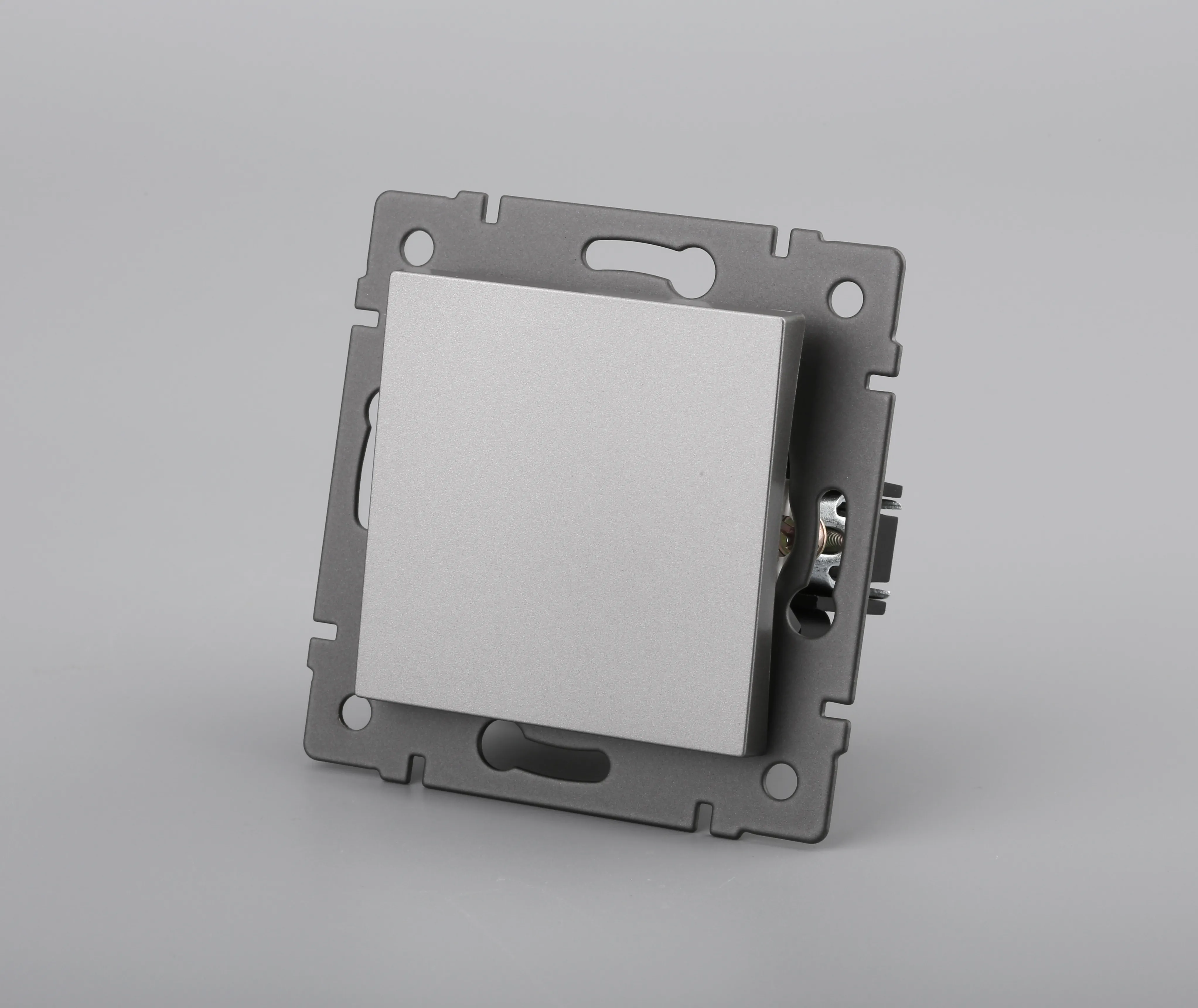 Механизм выключателя света клавишный на 1 пост 1 клавиша (проходной). Цвет - серый. Без фронтальной рамки. Уровень пылевлагозащиты IP20. Выключатель устанавливается в стандартный круглый подрозетник.