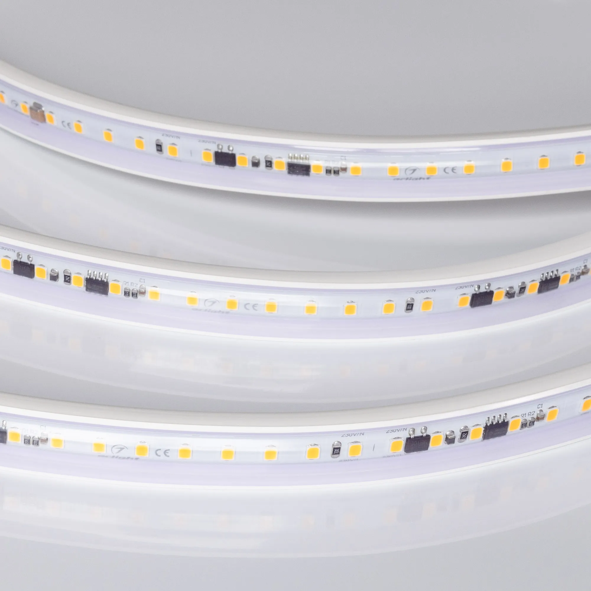 Светодиодная герметичная лента ARL серии A120, IP65 (PVC - трубка ПВХ экструзия). Светодиоды SMD 2835, 120 шт/м, белая плата шириной 12 мм, крепление на силиконовые скобы (скотч 3M отсутствует). Цвет ТЕПЛЫЙ 3000K, индекс цветопередачи CRI>85, угол 120°. Питание 230 В, мощность 15 Вт/м (750 Вт на 50 м). Размеры 50000x15x6.5 мм. Мин. отрезок 100 мм, 12 светодиодов. Цена за 1 м.