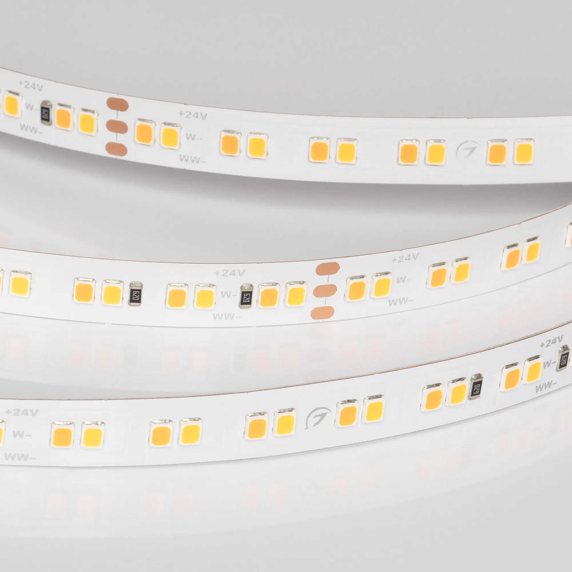 Светодиодная лента UL серии A160 с изменяемым цветом свечения. Светодиоды SMD 2835, 160 шт/м, белая плата шириной 10 мм, скотч 3M. Цвет MIX ТЕПЛЫЙ 3000K + ТЕПЛЫЙ 1900K, индекс цветопередачи CRI>90, угол 120°. Питание 24 В, мощность 15 Вт/м (75 Вт на 5 м). Размеры 5000x10x1.8 мм. Мин. отрезок 100 мм, 16 светодиодов. Цена за 1 м.