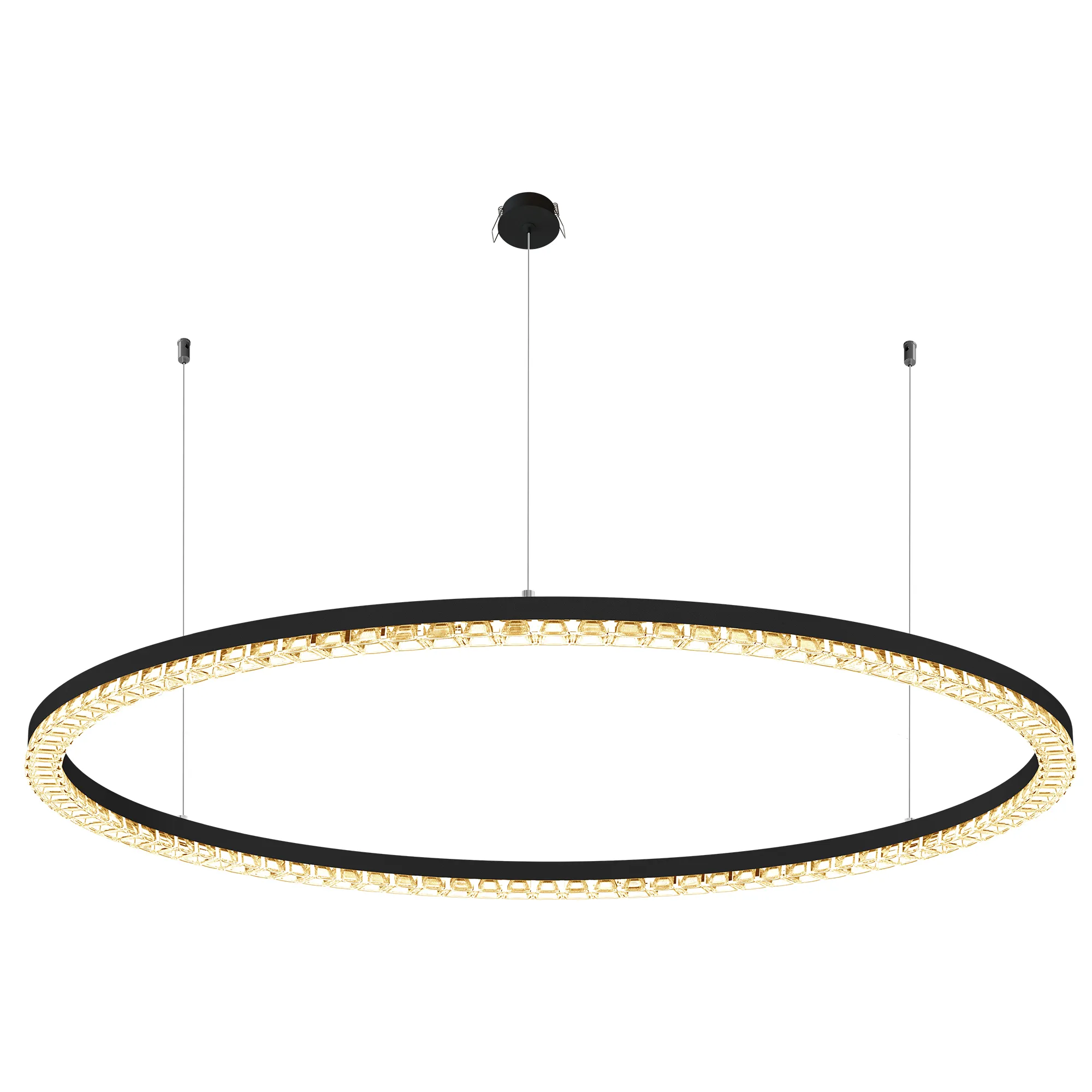 Подвесной светильник. Мощность 80 Вт, св. поток 6370 лм, 80-95лм/Вт, теплый 3000 K, CRI>90, угол 45°, напряжение питания 230 В. Черный круглый корпус из алюминия, экран PMMA, степень защиты IP20. Размер: диаметр 1250 мм, высота 34 мм, ширина профиля 30 мм, размер чаши: диаметр 65 мм, высота 26 мм. Монтаж подвесной, длина подвеса 1200 мм, тип чаши встраиваемый, диаметр установочного отверстия чаши 60 мм. Драйвер (2 шт) 9-38 В, 1050 мА. Пульсация <0,3 %.