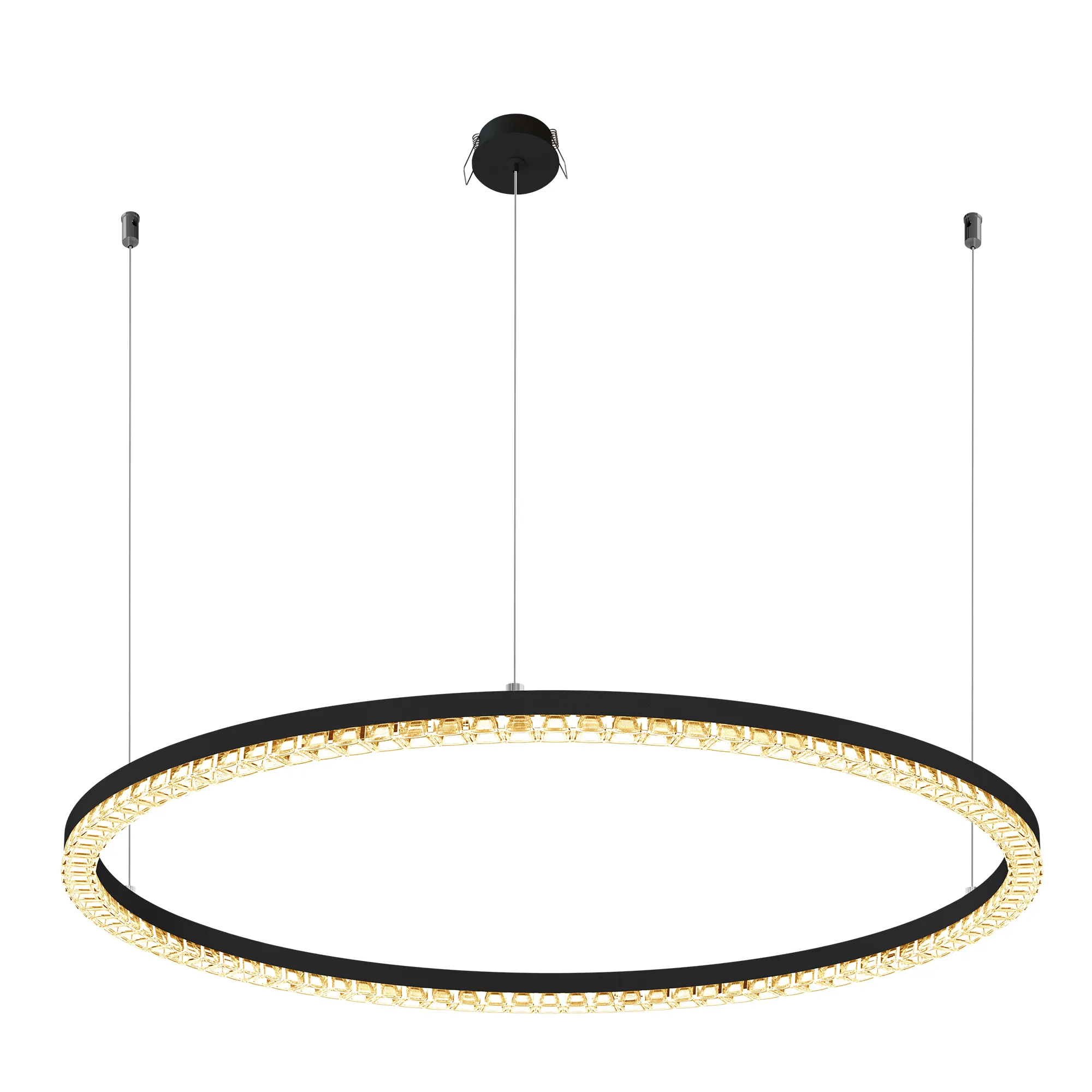 Подвесной светильник. Мощность 36 Вт, св. поток 2900 лм, 80-95 лм/Вт, теплый 3000K, CRI>90, угол 45°, напряжение питания 230 В. Чёрный круглый корпус из алюминия, экран PMMA, степень защиты IP20. Размер: диаметр 650 мм, высота 34 мм, ширина профиля 30 мм, размер чаши: диаметр 65 мм, высота 26 мм. Монтаж подвесной, длина подвеса 1200 мм, тип чаши встраиваемый, диаметр установочного отверстия чаши 60 мм. Драйвер 27-38 В, 1050 мА. Пульсация <0,3%.
