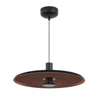 Подвесной светильник. Мощность 12 Вт, св. поток 768 лм, 64 лм/Вт, теплый 3000 K, CRI>94, угол 36°, напряжение питания 230 В.Черный фигурный плафон из переработанного фетра с кофейной внутренней поверхностью, линза-рассеиватель из PMMA, степень защиты IP20. Размер: диаметр 450 мм, высота 145 мм. Монтаж подвесной, длина подвеса 2000 мм, регулируемая. В комплекте 2 вида чаш. Габариты чаши (встраиваемая) Ø80 х 23 мм, врезное отверстие Ø60 мм. Габариты чаши (накладная) Ø120 x 35 мм. Драйвер 59В, 300 мА, пульсация <1%. Управление по TRIAC.