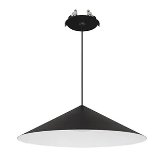 Подвесной светильник. Мощность 10 Вт, св. поток 600 лм, 60лм/Вт, теплый 2700 K, CRI>94, угол 36°, напряжение питания 230 В. Черный корпус из алюминия в форме конуса с белой внутренней поверхностью, линза-рассеиватель из PMMA, степень защиты IP20. Размер: диаметр 300 мм, высота 80 мм. Монтаж подвесной, длина подвеса 2000 мм, регулируемая. В комплекте две чаши. Габариты чаши (встроенной) Ø80 х 41 мм, врезное отверстие Ø55 мм, габариты чаши (накладной) Ø110 х 25 мм. Драйвер 2,8-12В, 500мА, пульсация <1%. Управление по TRIAC.
